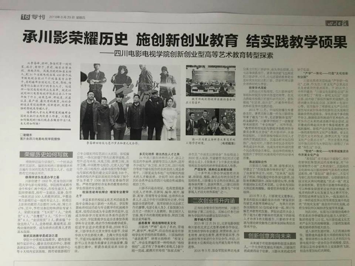 近日,省内多家官方主流媒体大篇幅报道川影创新创业型艺术大学改革发展成果。四川日报于6月23日在教育版用半版篇幅,以“承川影荣耀历史 施创新创业教育 结实践教学硕果”为标题,全面报道了我院的办学成果以及未来的...