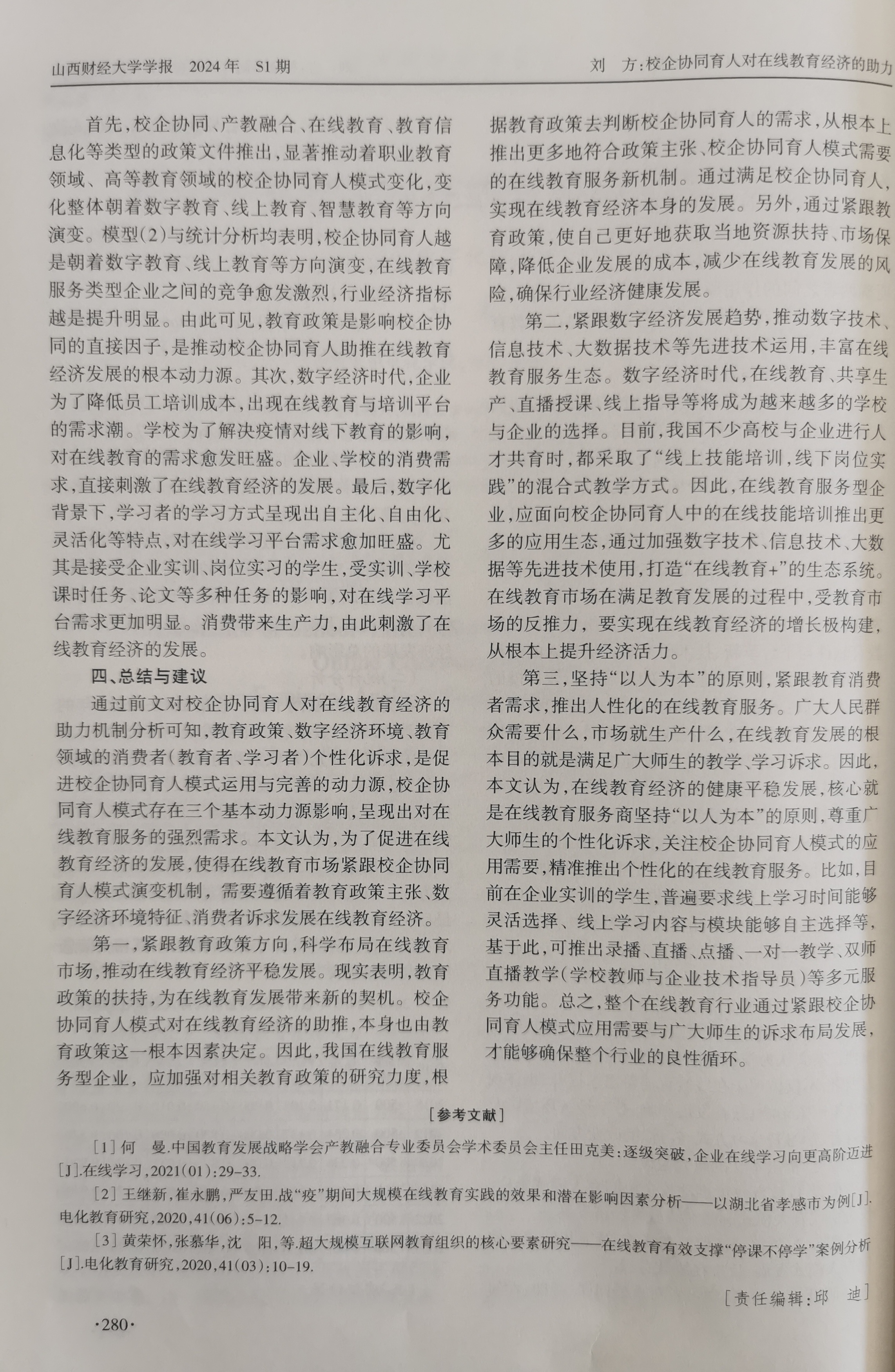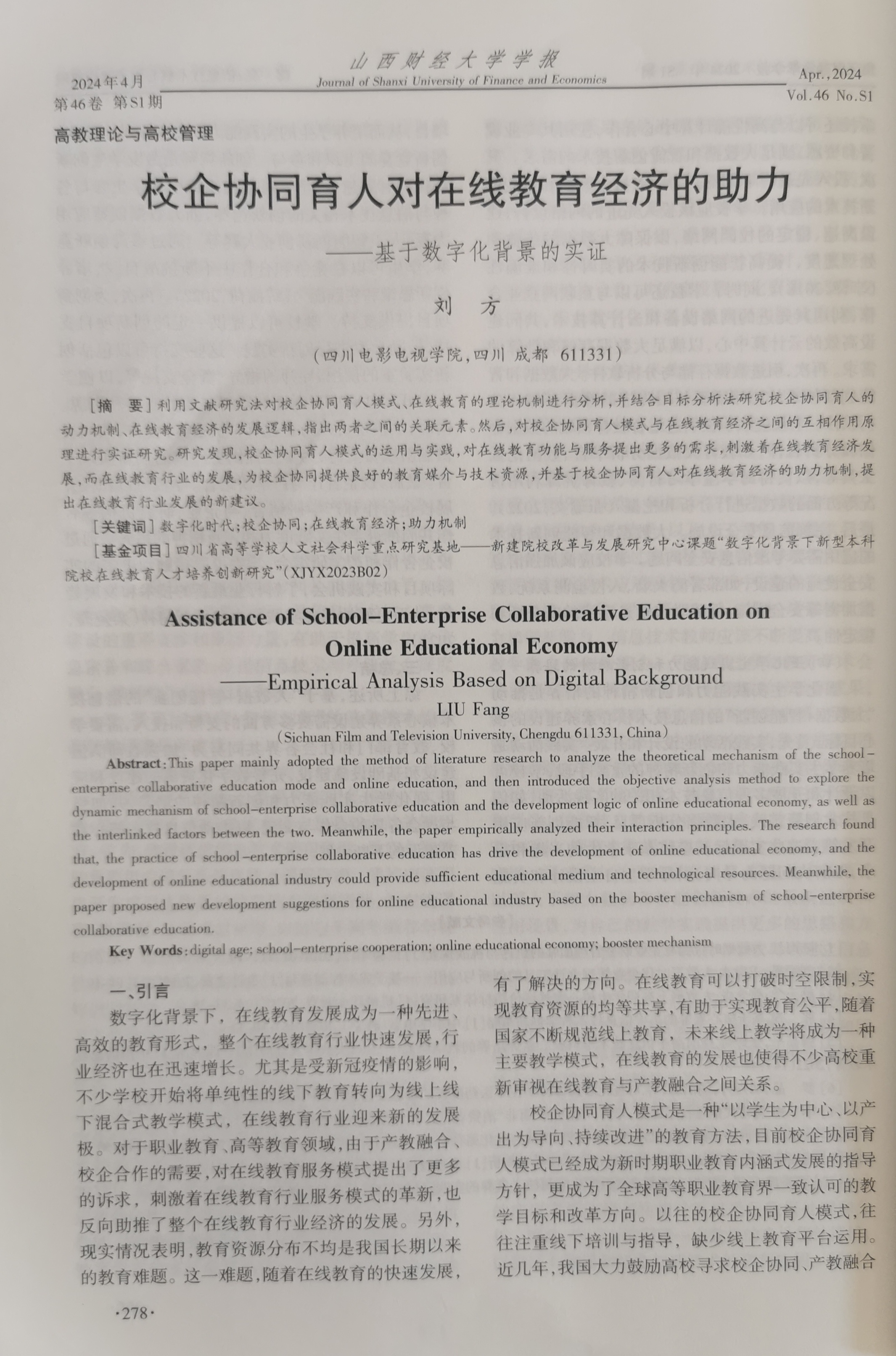 近日,我校播音主持学院刘方副教授撰写的论文《校企协同育人对在线教育经济的助力——基于数字化背景的实证》在全国中文核心期刊《山西财经大学学报》正式发表。