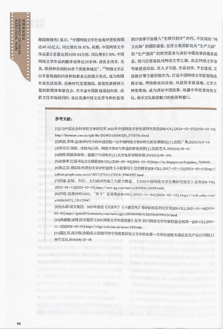 该文提出:依托强大的故事叙述力、跨媒介的内容延展力、深厚的粉丝影响力,网络文学正以丰富饱满的内容和创新多元的媒介形式,成为刻画社会生活场景、反映时代发展潮流、展现民族精神力量的重要载体。四川盛以其丰富的巴蜀文化滋养了《斗破穹苍》等众多优秀网络文学作品,拥有庞大的网络作家群。然而,四川网络文学发展也面临着创作人才流失、IP外流现象严重等突出问题。在成渝地区双城经济圈建设战略和媒介融合的时代潮流下,川渝两地应加强区域合作,聚焦精品创作生产,借鉴杭州网络文学之都等建设经验,从人才引留、精品创作、平台建设和文旅融合等方面积极作为。