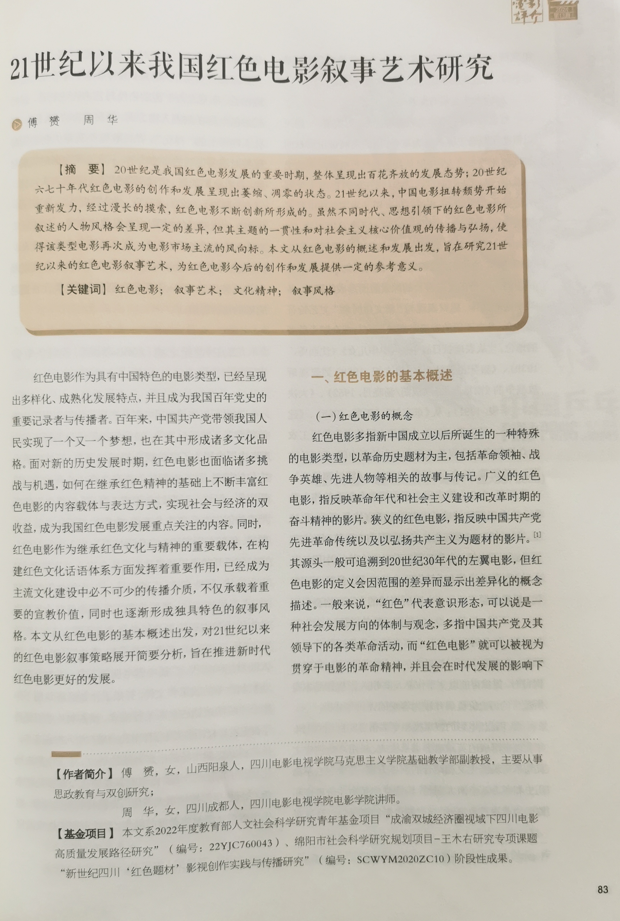 近日,我校招生就业处副处长傅赟副教授撰写的论文《21世纪以来我国红色电影叙事艺术研究》在全国中文核心期刊《电影评介》正式发表。该论文为2022年度教育部人文社会科学研究青年基金项目《成渝双城经济圈视域下四川电影高质量发展路径研究》(编号:22YJC760043)、四川王右木研究中心项目《新世纪四川“红色题材”影视创作实践与传播研究》(编号:SCWYM2020ZC10)阶段性成果。