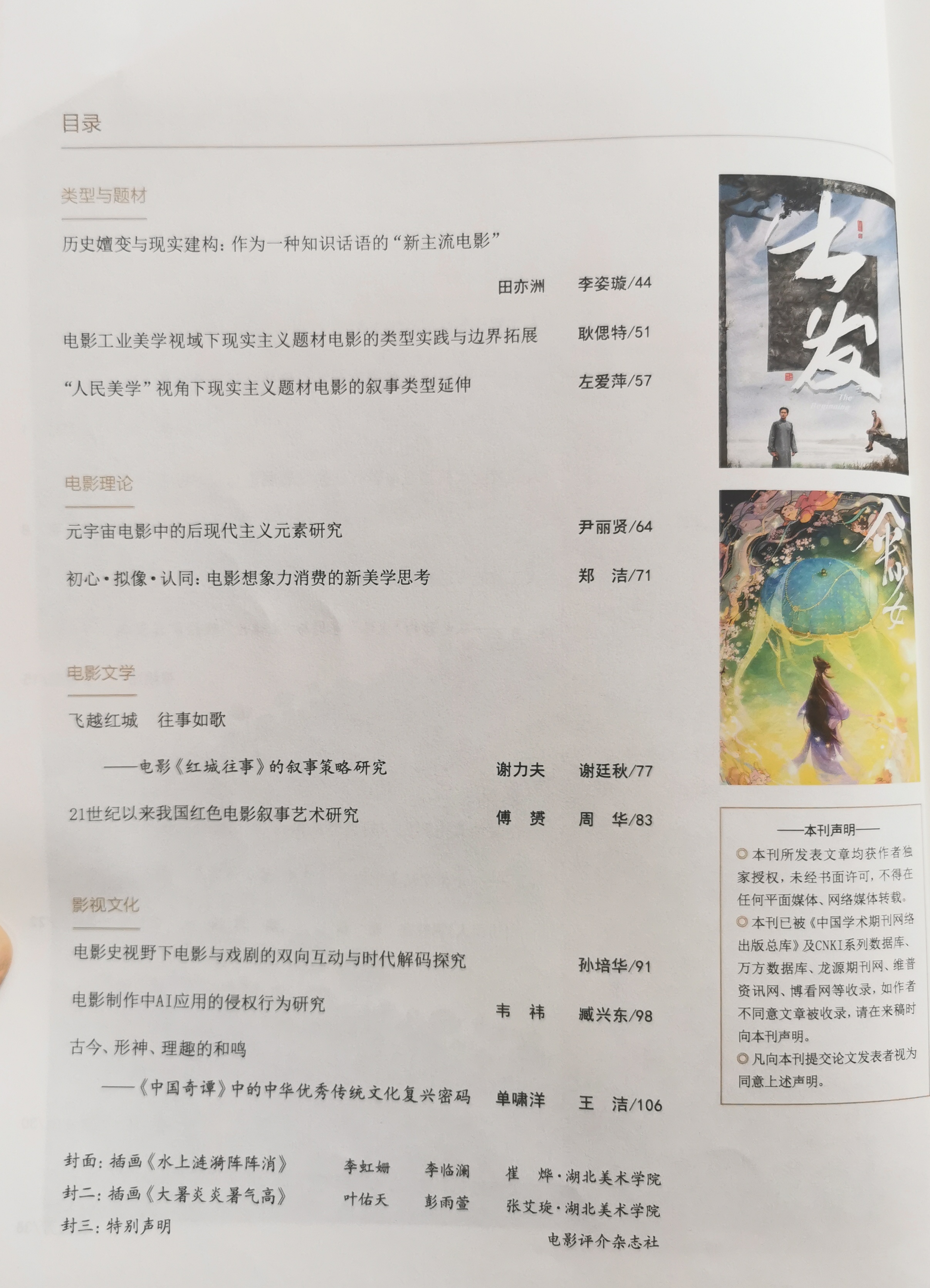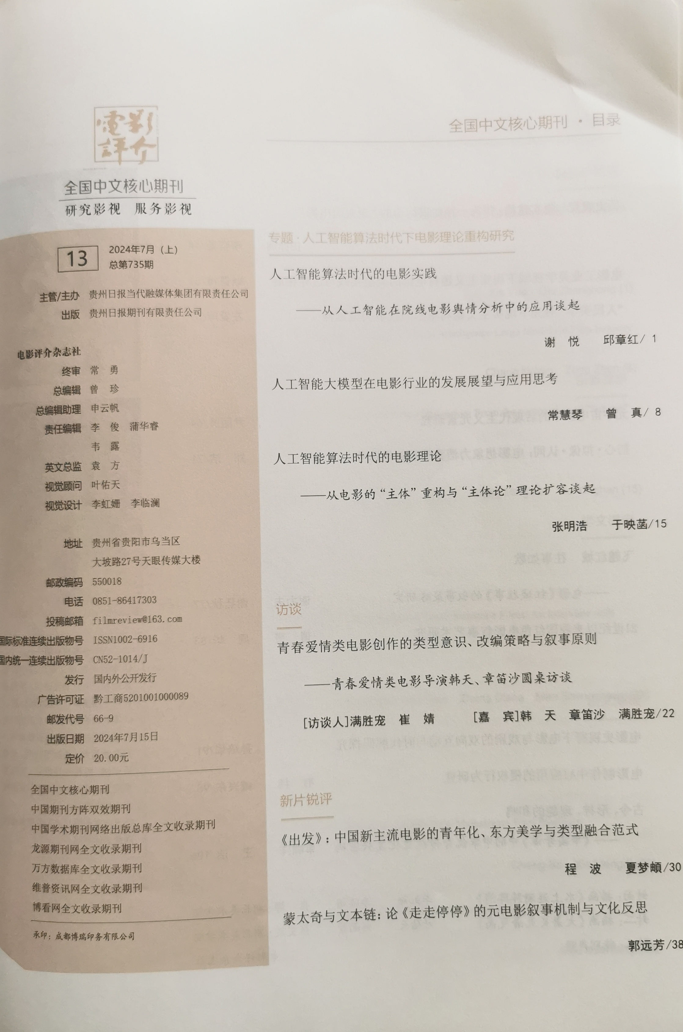 《电影评介》创刊于1979年,是一本在全国具有相当影响力、并具有海外发行权的电影专业刊物。创刊至今已经出版400期。单月最高发行量曾突破50万册,多次获得“全国影评工作先进集体”“贵州省优秀社科期刊”“贵州省报刊整体设计奖”以及中华人民共和国新闻出版总署授予的“双效”期刊等荣誉奖项。文章被国家新闻出版总署、维普网、万方数据库、知网数据库收录。主要栏目有:专家来稿、博士论坛、中国电影评论、外国电影评论、电影文学、电影理论、荧屏广角、影视教育、文化艺术等。主要内容包括:影视理论,影视文化,影视文艺,影视动画学,影视专题,影视管理,影视美学,影视文学,影视教育,影视布景,影视广告,影视产品营销,影视技术,影视服饰,影视效果设计,影视文献回顾,影视史研究,影视资料赏析,影视潮流分析,影视产业分析,影视前沿,影视人物采访,影视产业或创作与传播学,电脑,数码,美术,音乐,戏曲,舞蹈,艺术,新闻,传媒、传播学、哲学、社会、文化等各学科的交叉研究。北京大学《中文核心期刊要目总览》来源期刊:1992年(第一版),1996年(第二版),2004年版,2014年版,2017年版,2020年版,2023年版。(2023版)复合影响因子:0.29(2023版)综合影响因子:0.069,期刊荣誉:社科双效期刊。