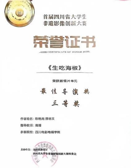 电影学院综合实训短片《生吃海椒》在首届四川省大学生非遗影像创新大赛剧情片单元中获得最佳导演奖三等奖。