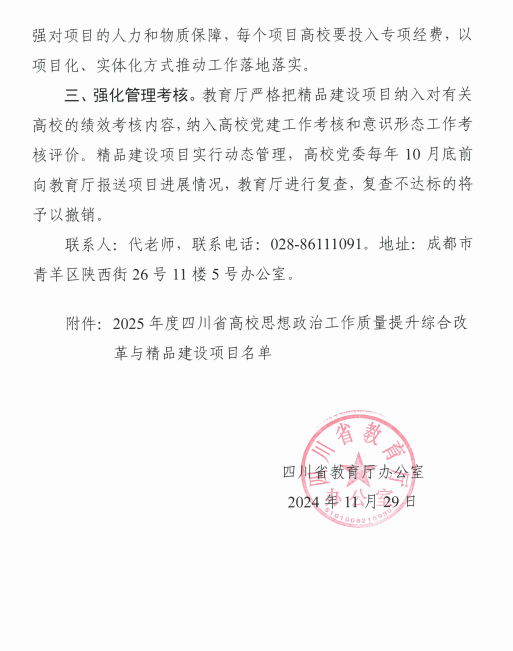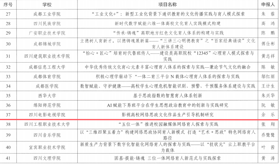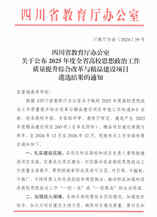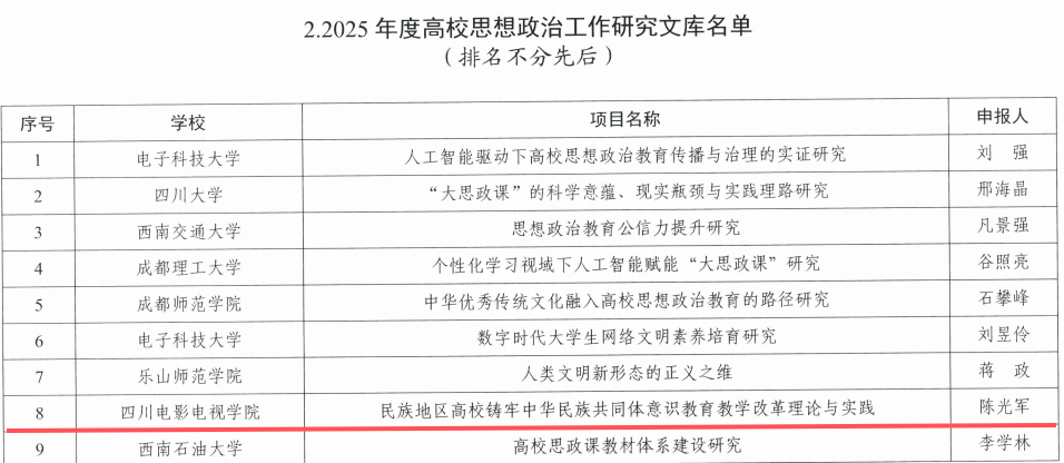 近日,从四川省教育厅获悉,我校宣传部副部长余乐、马克思主义学院陈光军老师分别主持申报的《影视高校网络思政文化作品生产引导机制研究》和《民族地区高校铸牢中华民族共同体意识教育教学改革理论与实践》项目获2025年度四川省高校思想政治工作质量提升综合改革与精品建设项目立项,请项目组成员按照四川省高校思想政治工作质量提升综合改革与精品建设项目管理办法做好后续研究。