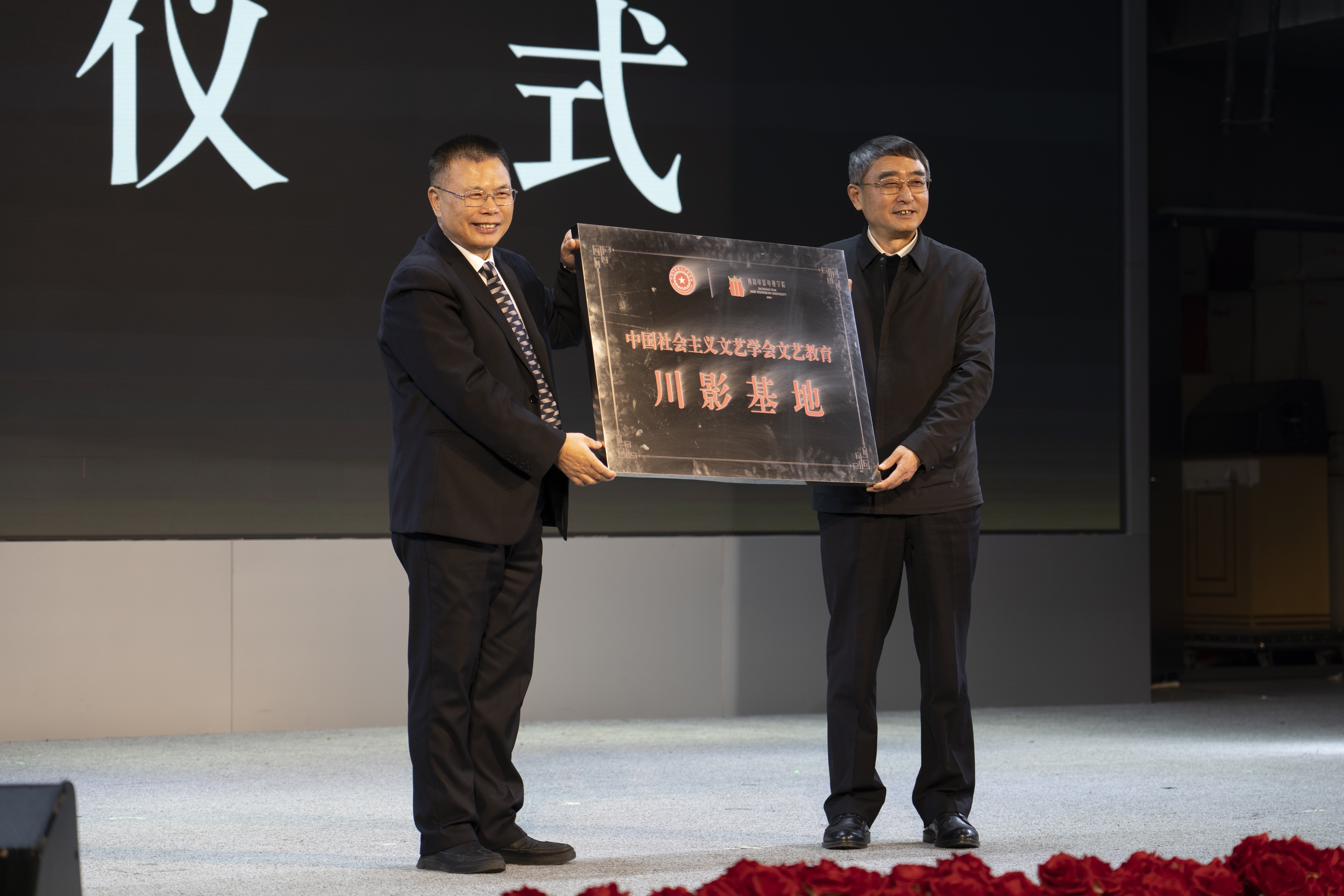 佟学主席宣读了《关于设立“中国社会主义文艺学会文艺教育川影基地”的决定》,并向学校授牌,党委书记王小林代表学校接牌。