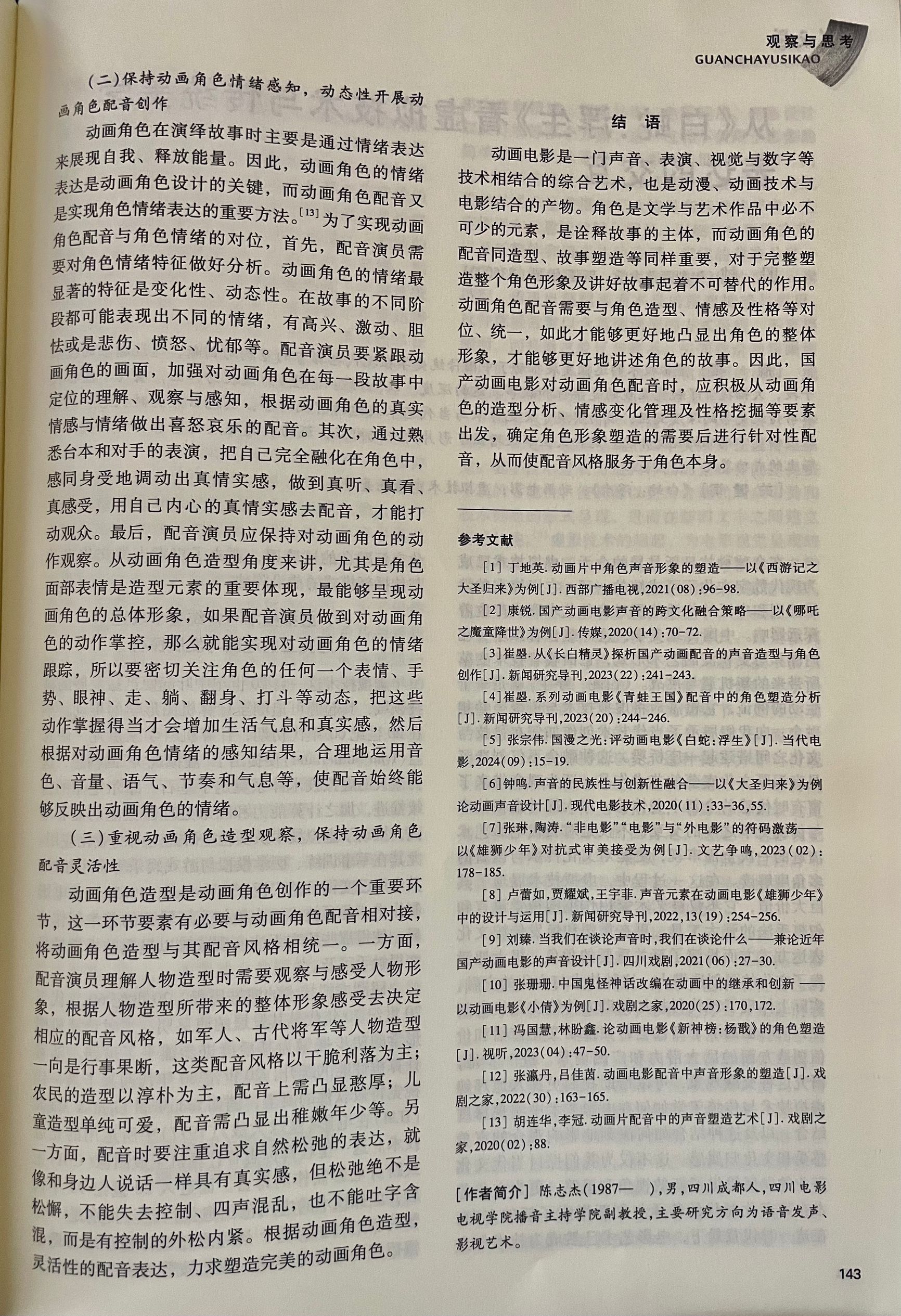 近日,我校陈志杰副教授撰写的论文《动画电影中的角色配音创作与角色对位》在全国中文核心期刊《电影文学》正式发表。该论文为四川省高等学校人文社会科学重点研究基地——新建院校改革与发展研究中心项目《数字化背景下新型本科院校在线教育人才培养创新研究》(项目编号:XJYX2023B02)的阶段性成果。