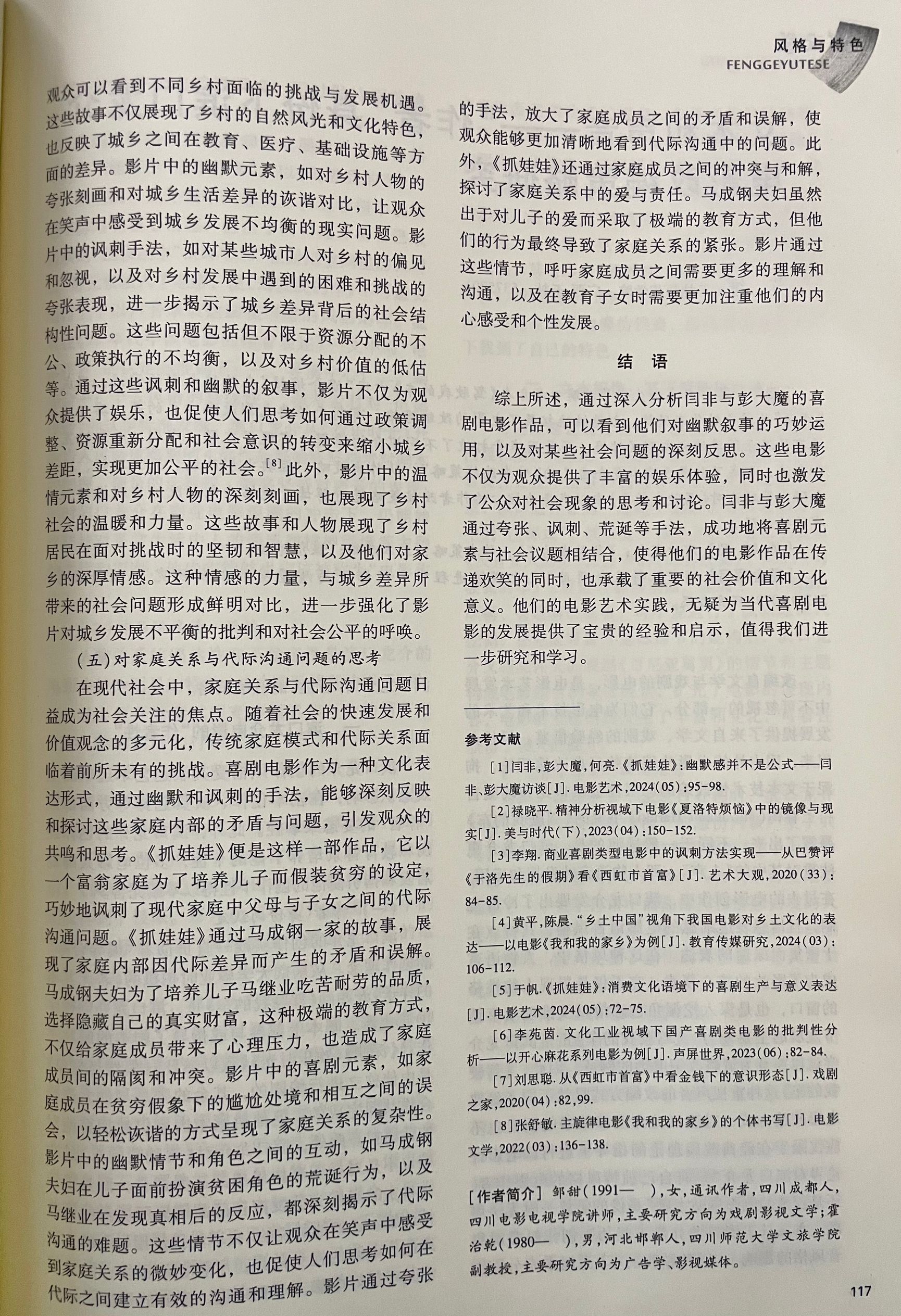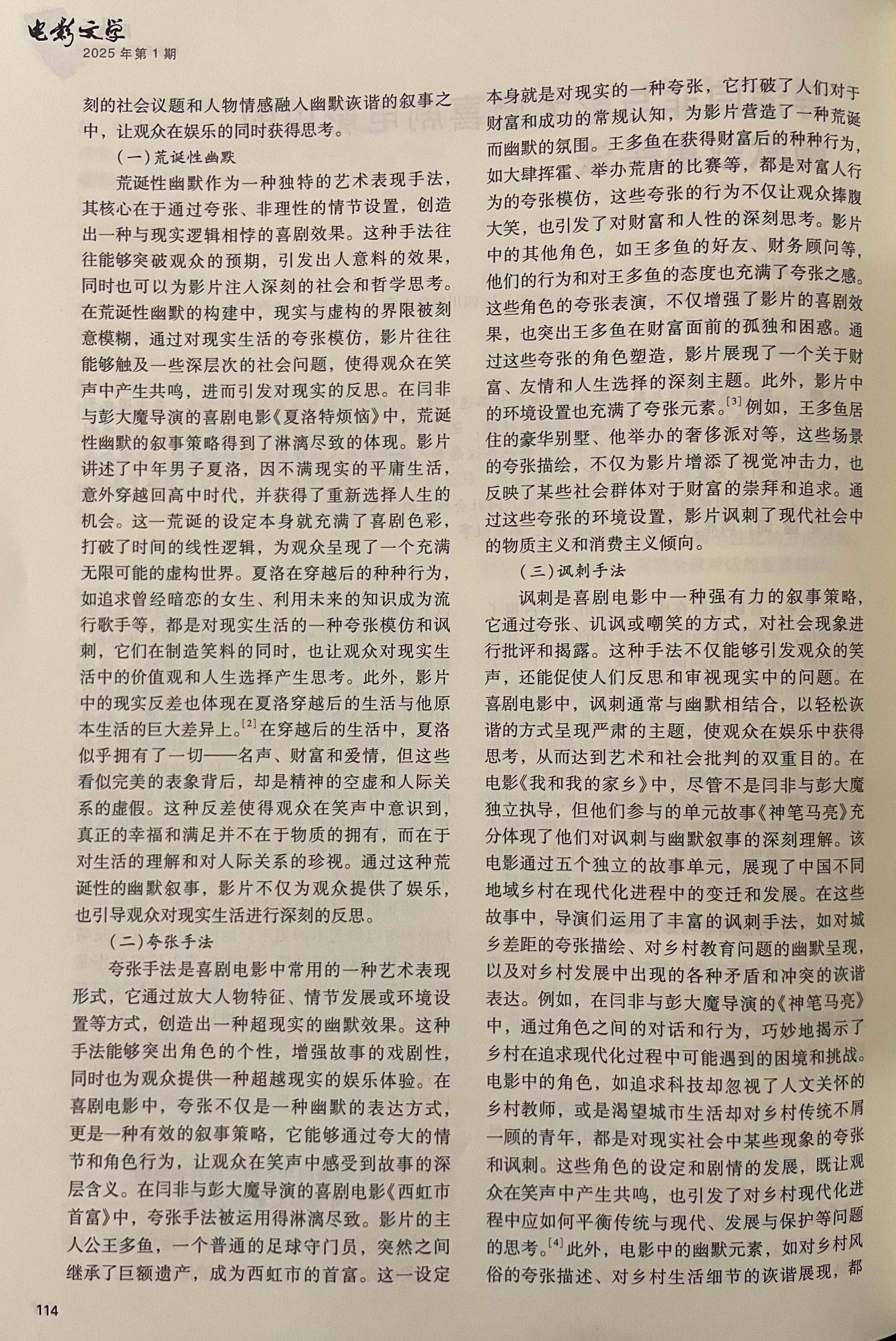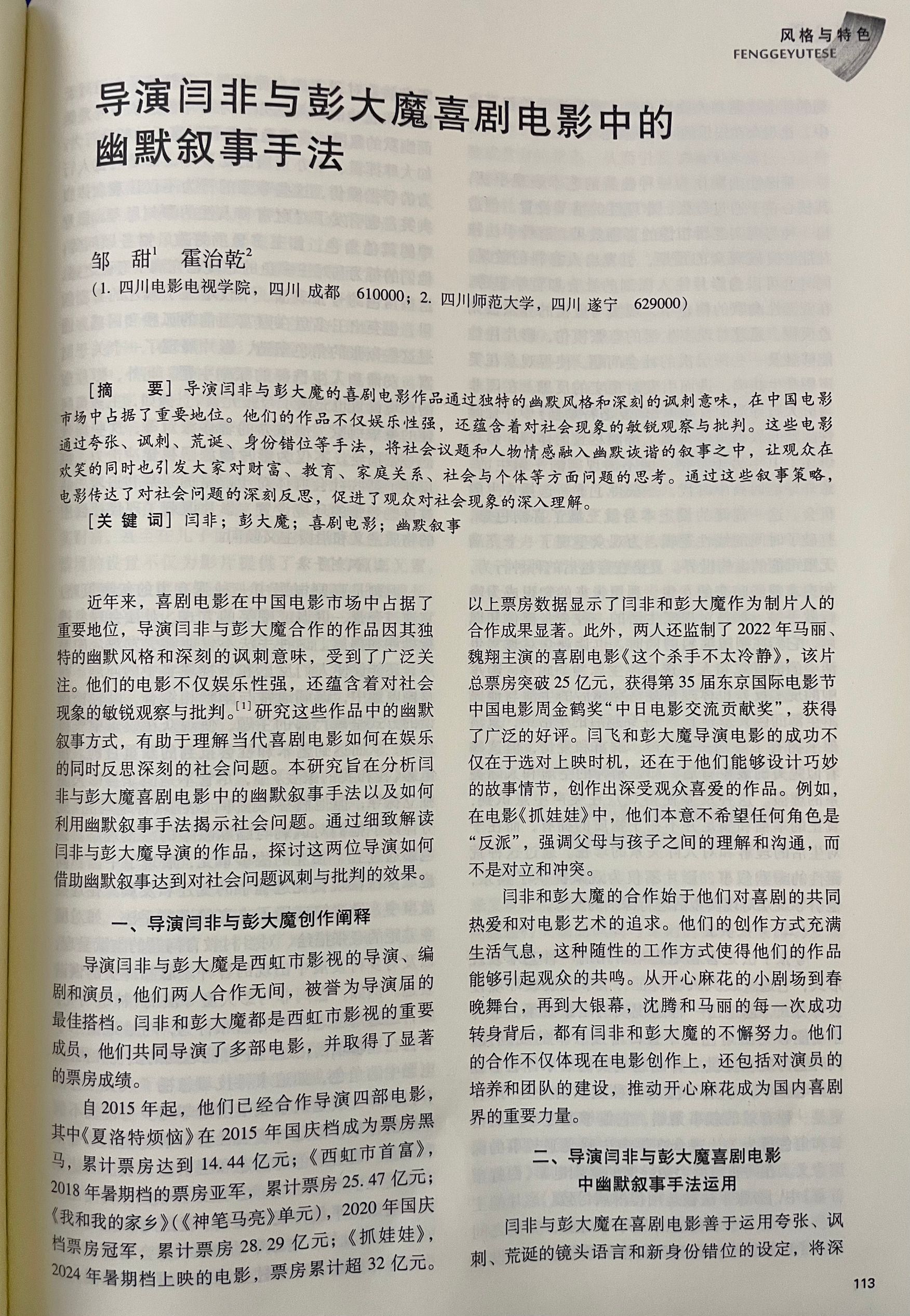 近日,我校邹甜老师联合四川师范大学文旅学院霍治乾副教授共同撰写的论文《导演闫非与彭大魔喜剧电影中的幽默叙事手法》在全国中文核心期刊《电影文学》正式发表。