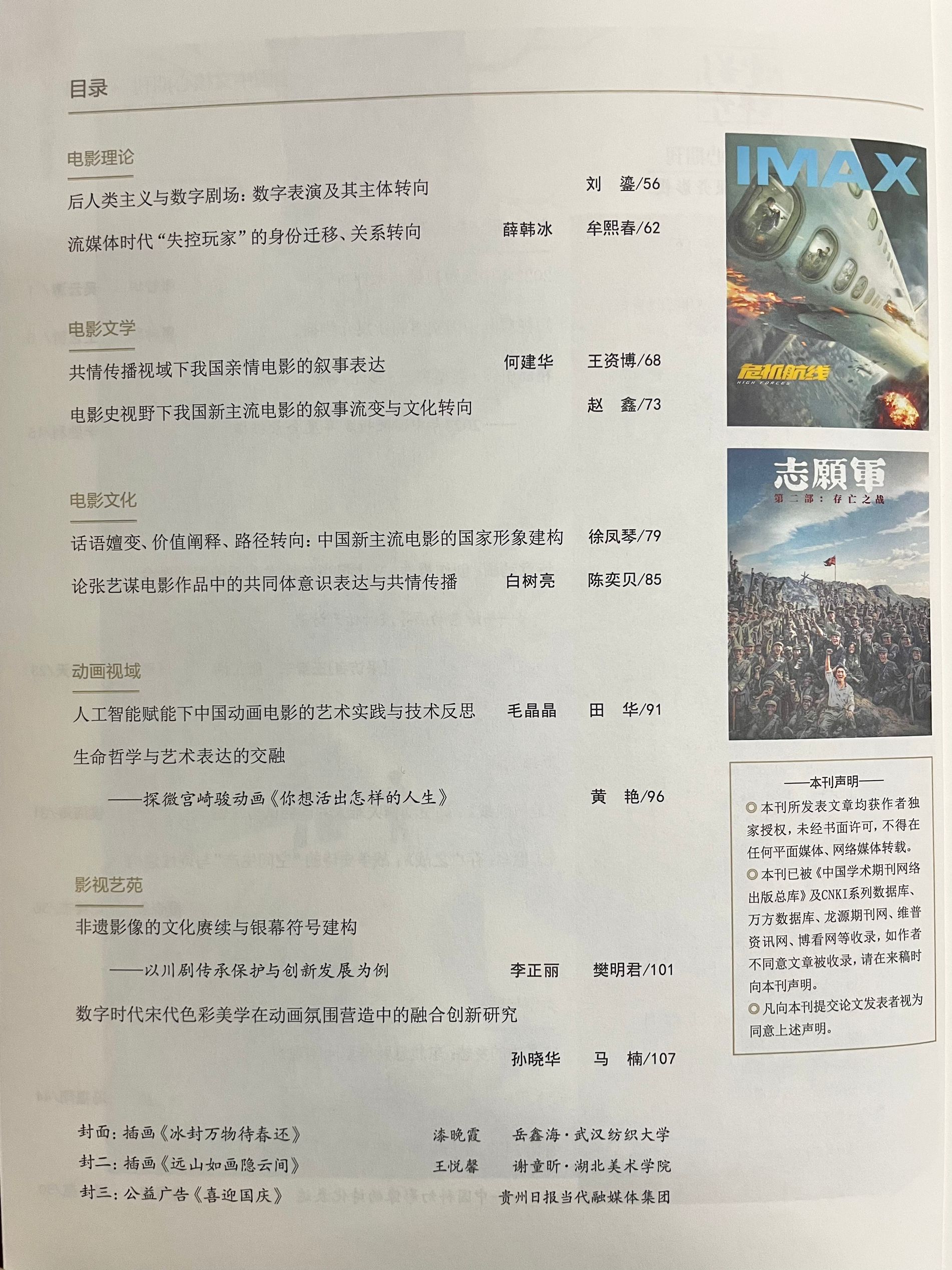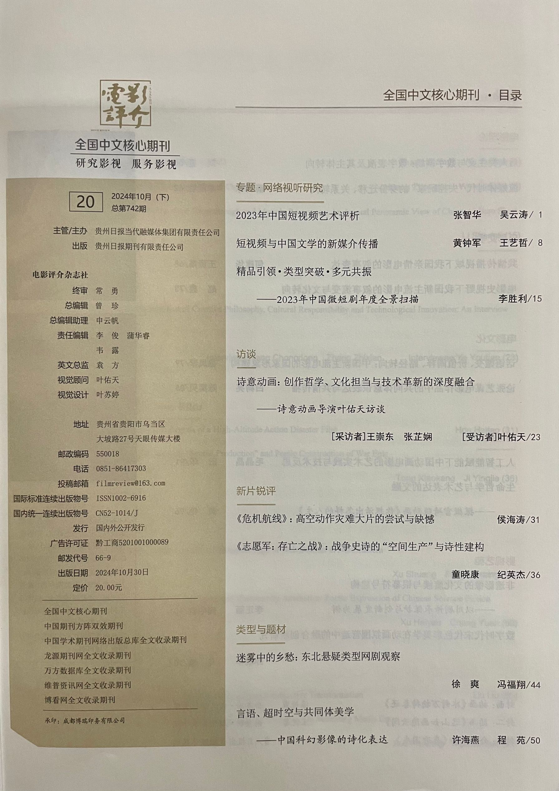 《电影评介》创刊于1979年,是一本在全国具有相当影响力、并具有海外发行权的电影专业刊物。创刊至今已经出版400期。单月最高发行量曾突破50万册,多次获得“全国影评工作先进集体”“贵州省优秀社科期刊”“贵州省报刊整体设计奖”以及中华人民共和国新闻出版总署授予的“双效”期刊等荣誉奖项。文章被国家新闻出版总署、维普网、万方数据库、知网数据库收录。主要栏目有:专家来稿、博士论坛、中国电影评论、外国电影评论、电影文学、电影理论、荧屏广角、影视教育、文化艺术等。主要内容包括:影视理论,影视文化,影视文艺,影视动画学,影视专题,影视管理,影视美学,影视文学,影视教育,影视布景,影视广告,影视产品营销,影视技术,影视服饰,影视效果设计,影视文献回顾,影视史研究,影视资料赏析,影视潮流分析,影视产业分析,影视前沿,影视人物采访,影视产业或创作与传播学,电脑,数码,美术,音乐,戏曲,舞蹈,艺术,新闻,传媒、传播学、哲学、社会、文化等各学科的交叉研究。北京大学《中文核心期刊要目总览》来源期刊:1992年(第一版),1996年(第二版),2004年版,2014年版,2017年版,2020年版,2023年版。(2023版)复合影响因子:0.29(2023版)综合影响因子:0.069,期刊荣誉:社科双效期刊。