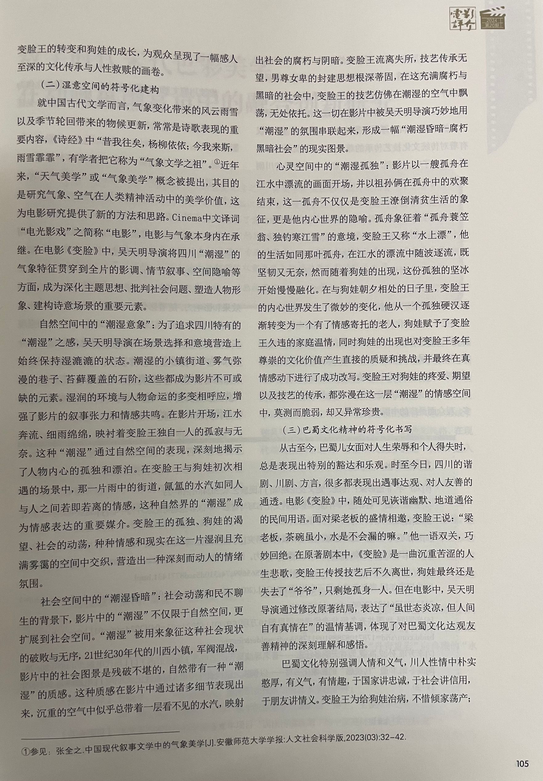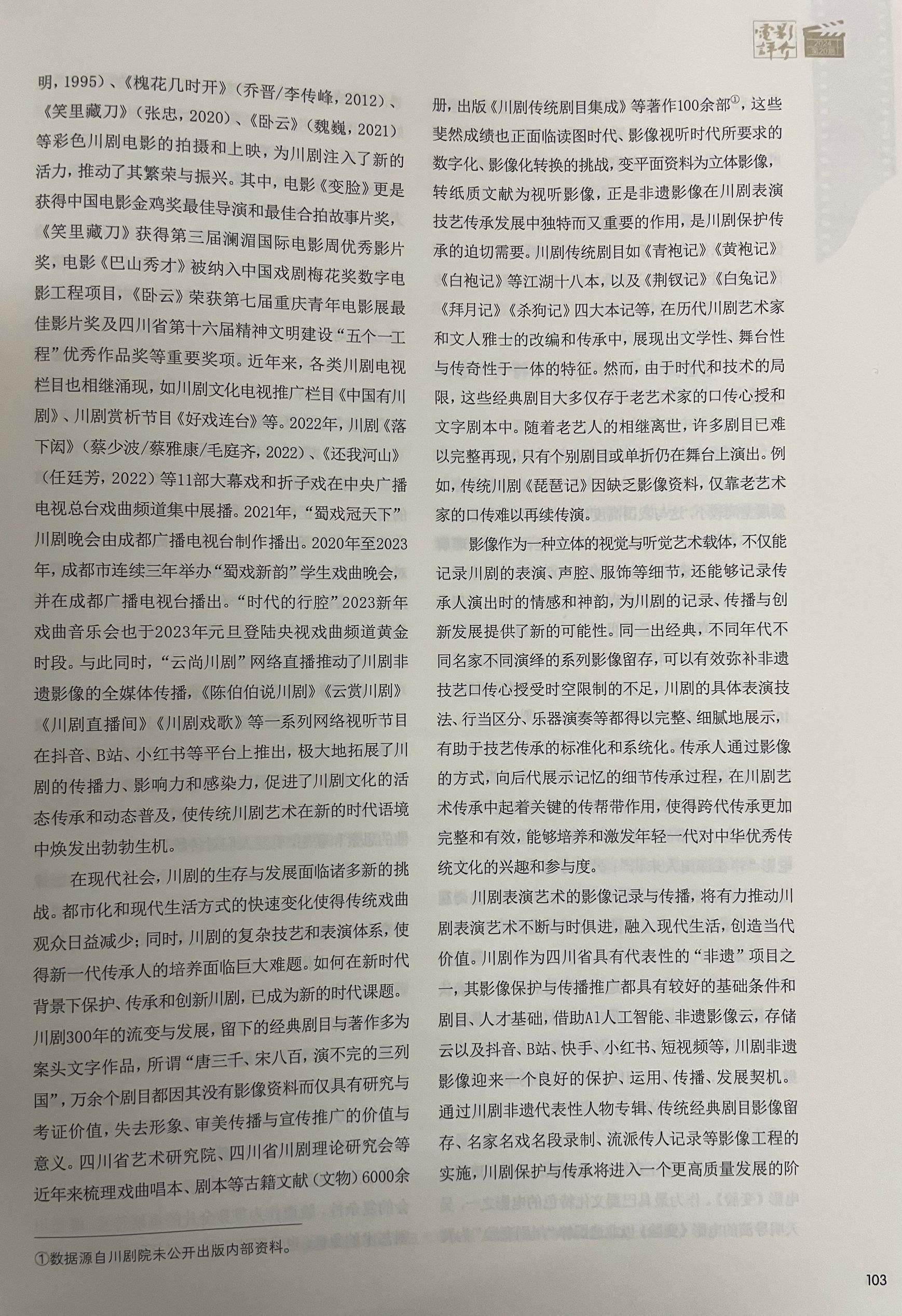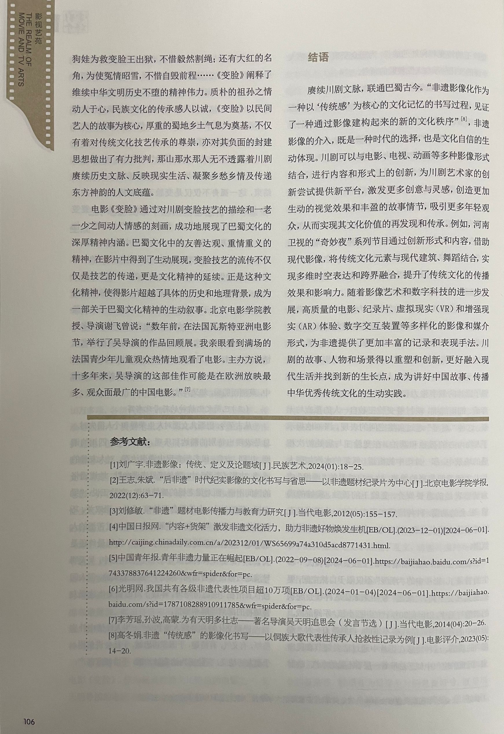 该文提出:“非物质”的特性决定了非遗传播对于保护的重要性,在强调活态传承,让非遗“见人见物见生活”的当代非遗保护语境下,通过发挥以文化人、以艺通心及寓无形传承于有形影像的重要作用,川剧这一古老的艺术形式焕发出新的生机与活力。以神话故事、民间文学及民俗活动等文化表现形式为载体的非遗,承载着各族人民在长期生活、生产实践中所形成的价值观念和精神气质,为中国影像创作提供了深厚的文化土壤。文章旨在探讨非遗影像在川剧传承保护与创作发展中的现状、地位和作用,并以吴天明导演电影《变脸》(吴天明,1995)为例,从“‘变脸’影像的符号化展现、诗意空间的符号化建构及巴蜀文化精神的符号化书写”三个维度分析电影文本中的川剧影像符号与意义生成,为非遗题材影像创作带来一定的启示。