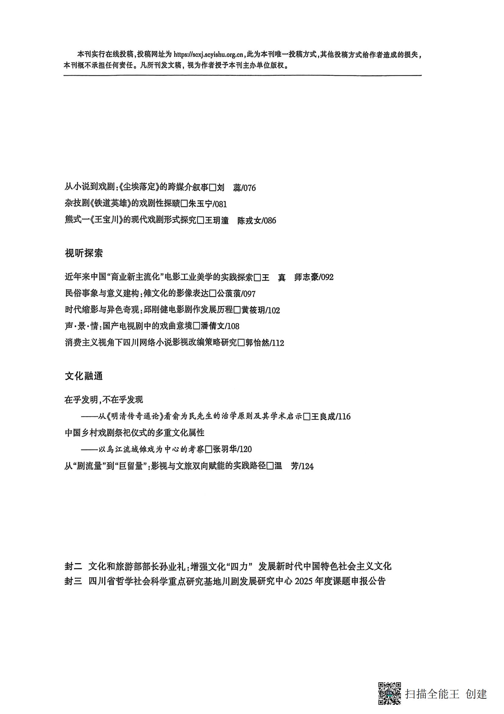 近日,我校郭怡然副教授撰写的论文《消费主义视角下四川网络小说影视改编策略研究》在全国中文核心期刊《四川戏剧》正式发表。该文系2021年度四川省哲学社会科学重点研究基地四川网络文学发展研究中心一般项目《消费主义视角下四川网络小说改编剧策略研究》(项目编号:WLWX—2021011)阶段性成果。