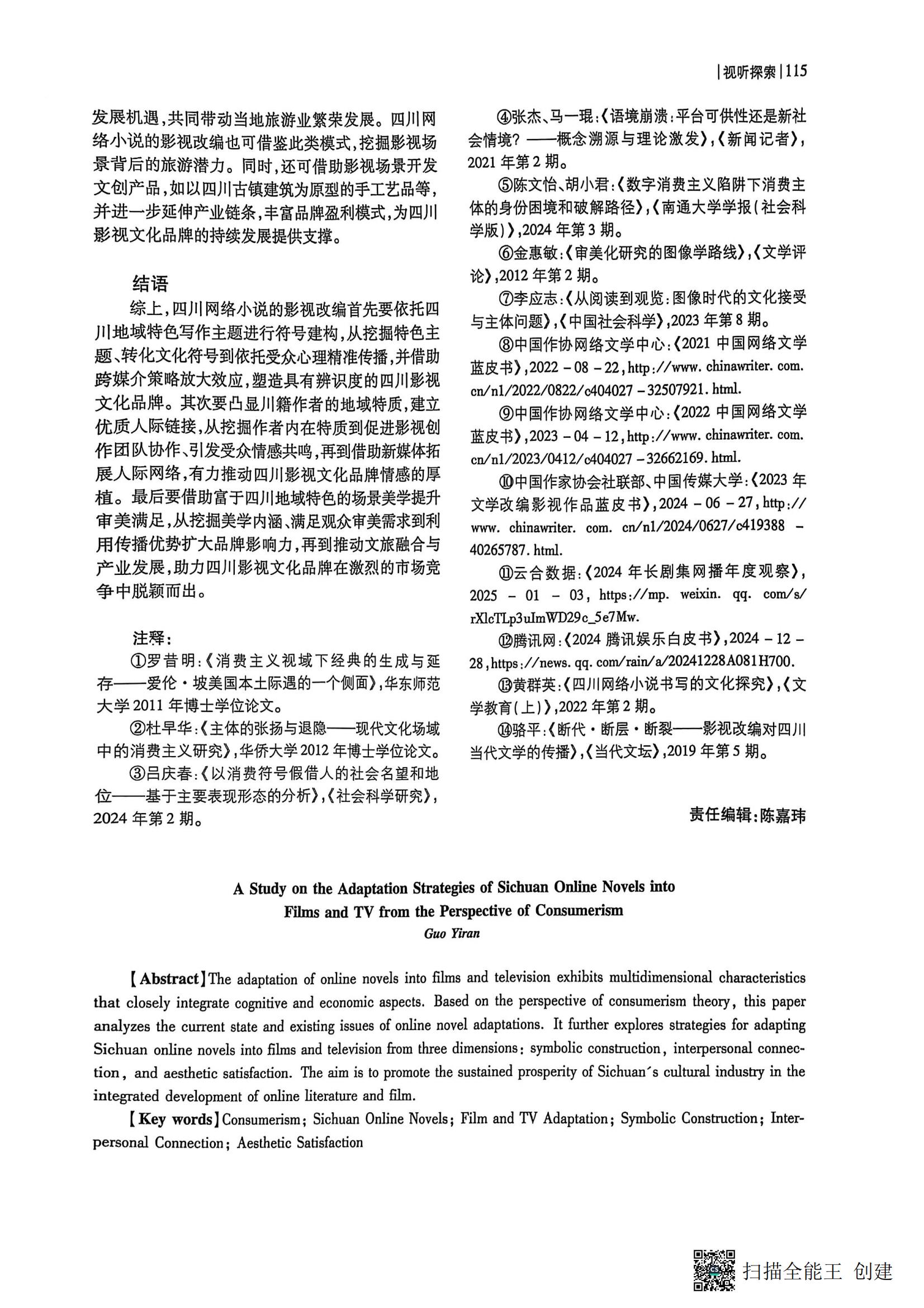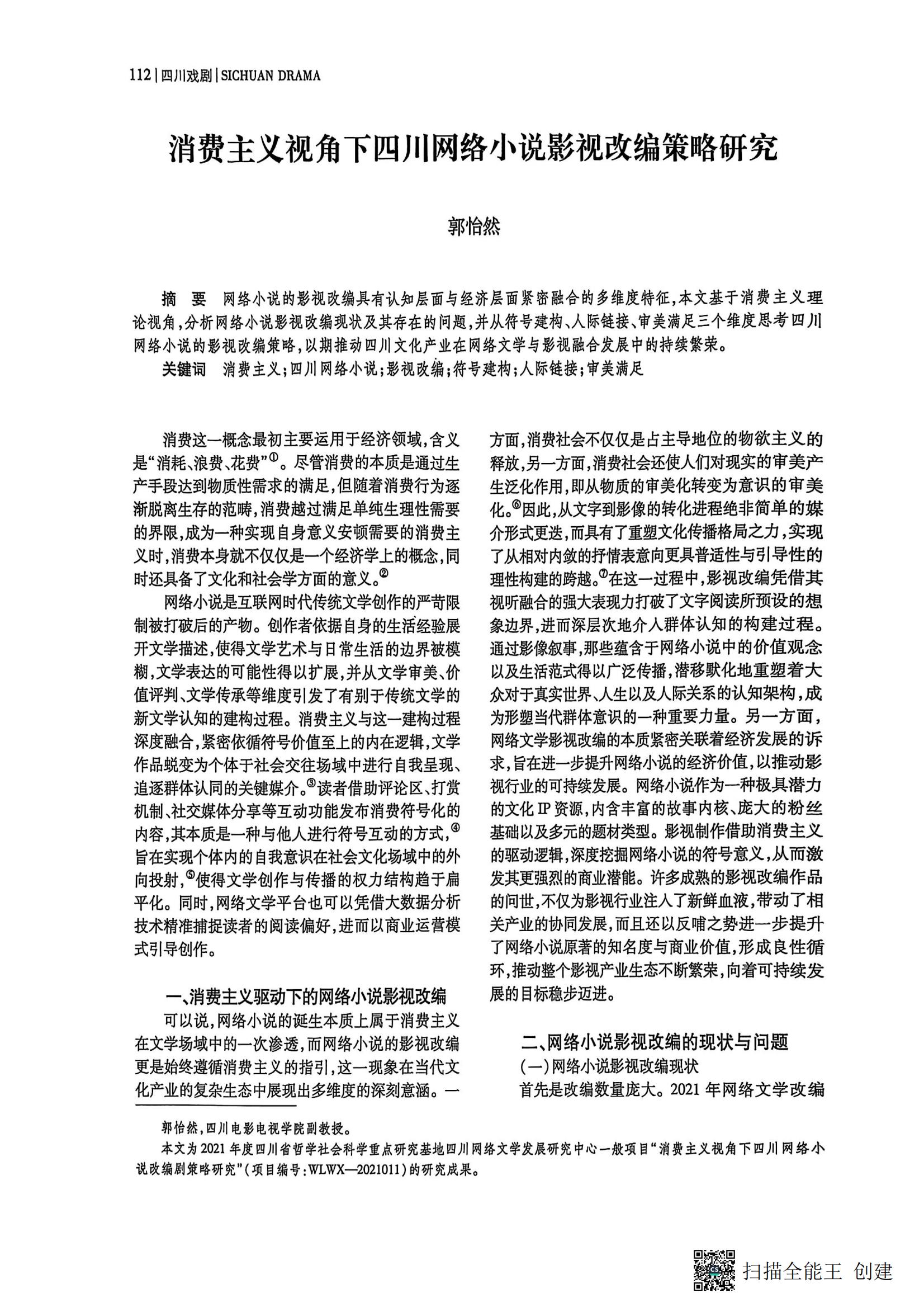 该文提出:网络小说的影视改编具有认知层面与经济层面紧密融合的多维度特征,文章基于消费主义理论视角,分析网络小说影视改编现状及其存在的问题,并从符号建构、人际链接、审美满足三个维度思考四川网络小说的影视改编策略,以期推动四川文化产业在网络文学与影视融合发展中的持续繁荣。