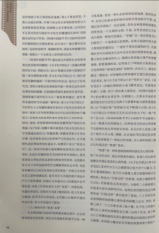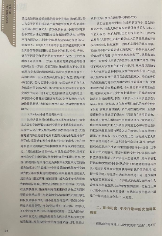 该文提出:女性力量的崛起和女性意识的觉醒催生了文艺作品的女性化创作倾向,女频穿越网文以独特的女性视角、新奇的叙事方式吸引了众多读者,据其改编的古装剧延续了原著小说的女性视角、情节设定和主题表达,即以女性角色的“穿越”为叙事起点和逻辑线索呈现她们在不同时空的生存境遇和价值追求,不同剧集在叙事风格、叙事策略、角色塑造、历史观念及女性表达等维度侧重点各异。文章认为当前热度较高的穿越古装剧在叙事建构和女性表达层面主要有三种方式:一是基于真实历史的女性个体叙事,二是模糊历史指向的女性群体叙事,三是拼贴戏仿历史的女性“爽感”叙事。