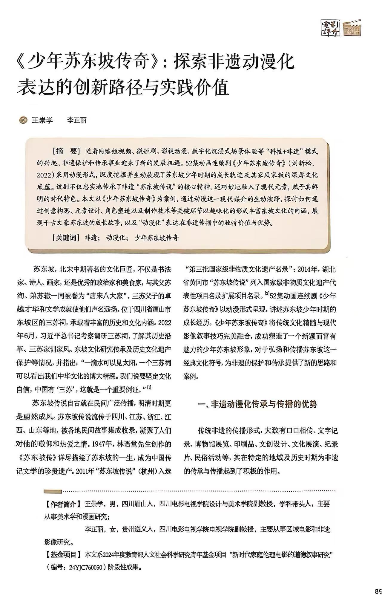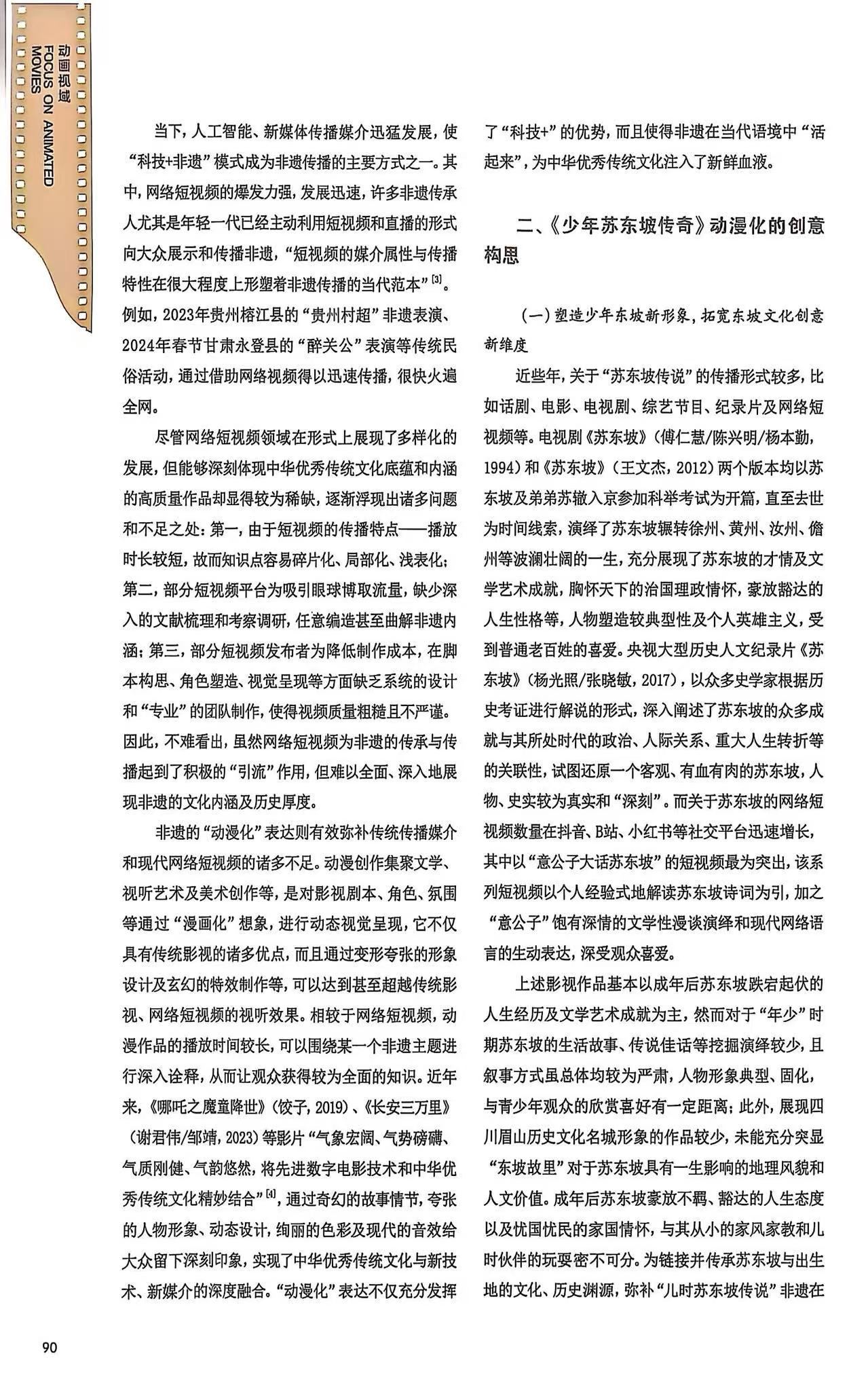近日,我校设计与美术学院专业带头人王崇学副教授撰写论文《<少年苏东坡传奇>:探索非遗动漫化表达的创新路径与实践价值》在全国中文核心期刊《电影评介》正式发表,该论文系2024年度教育部人文社会科学研究青年基金项目“新时代家庭伦理电影的道德叙事研究”(编号:24YJC760050)的阶段性成果。