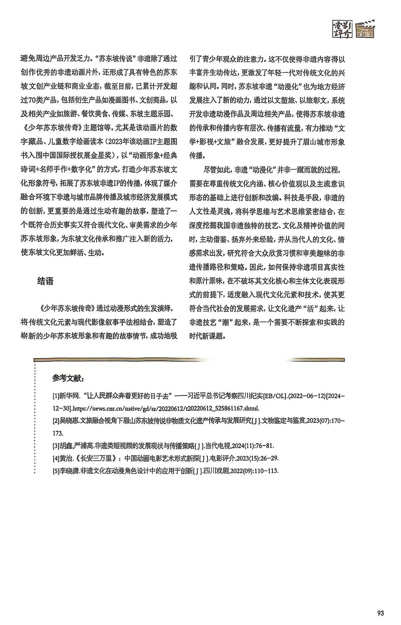 该文提出,随着网络短视频、微短剧、影视动漫、数字化沉浸式场景体验等“科技+非遗”模式的兴起,非遗保护和传承事业迎来了新的发展机遇。52集动画连续剧《少年苏东坡传奇》(刘新松,2022)采用动漫形式,深度挖掘并生动展现了苏东坡少年时期的成长轨迹及其家风家教的深厚文化底蕴。该剧不仅忠实地传承了非遗“苏东坡传说”的核心精神,还巧妙地融入了现代元素,赋予其鲜明的时代特色。本文以《少年苏东坡传奇》为案例,通过动漫这一现代媒介的生动演绎,探讨如何通过创意构思、元素设计、角色塑造以及制作技术等关键环节以趣味化的形式丰富东坡文化的内涵,展现千古文豪苏东坡的成长故事,以及“动漫化”表达在非遗传播中的独特价值与优势。
