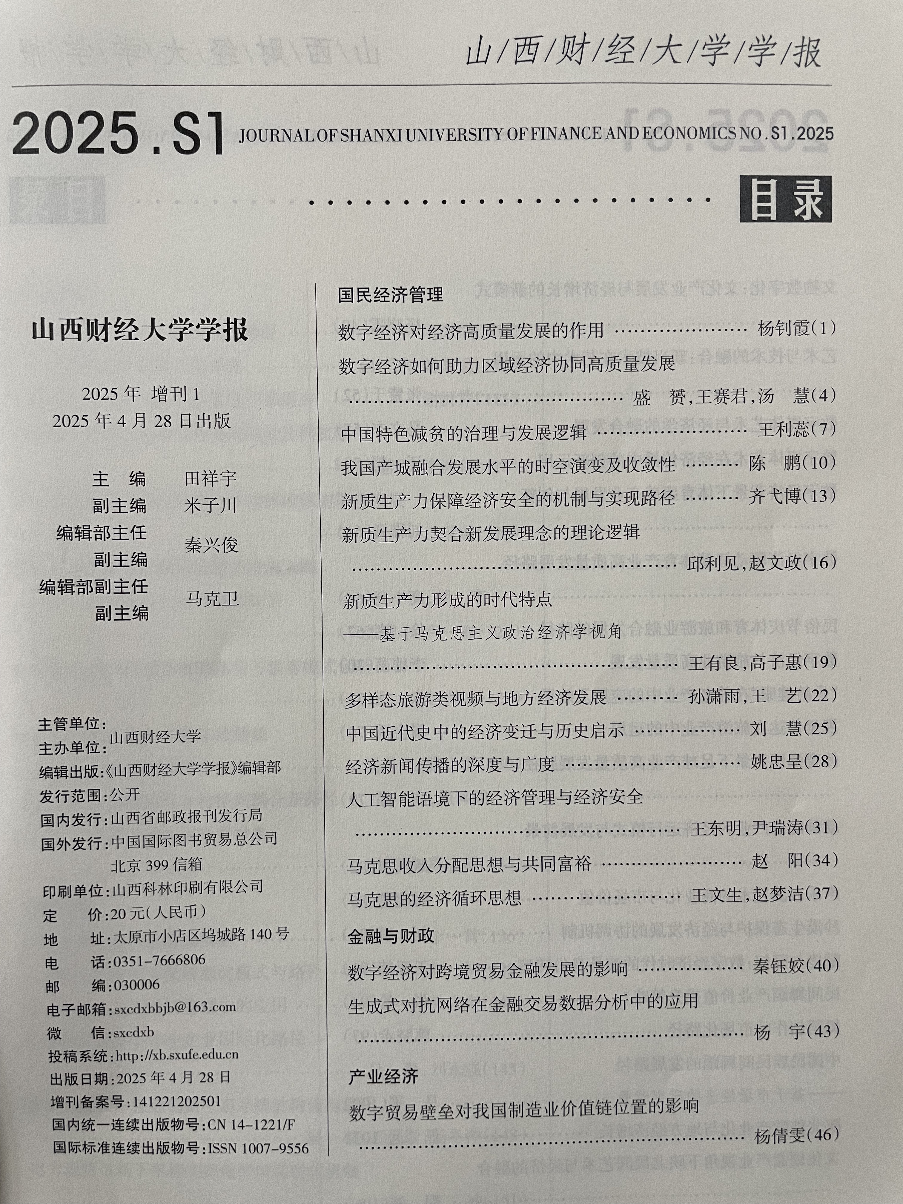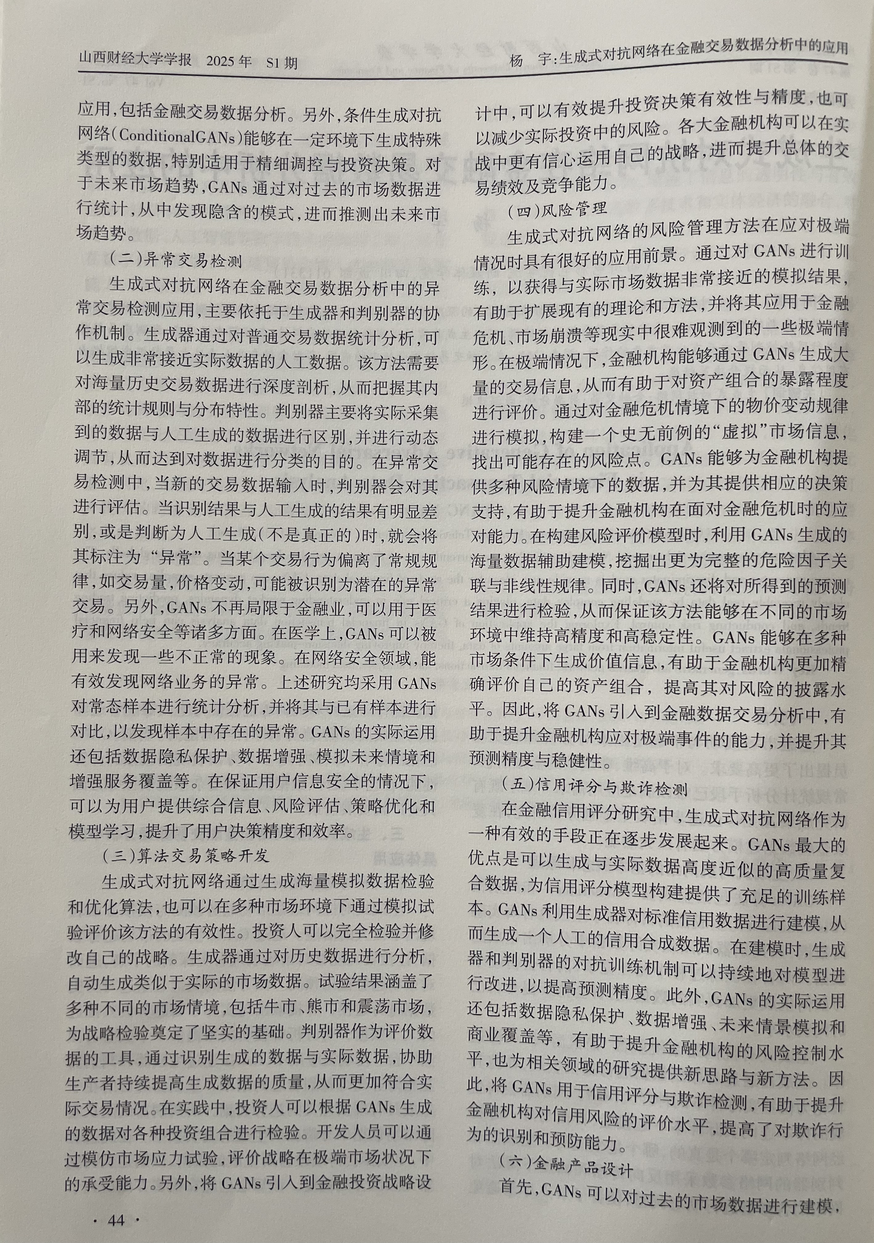 近日,我校杨宇老师撰写的论文《生成式对抗网络在金融交易数据分析中的应用》在CSSCI来源期刊《山西财经大学学报》正式发表。