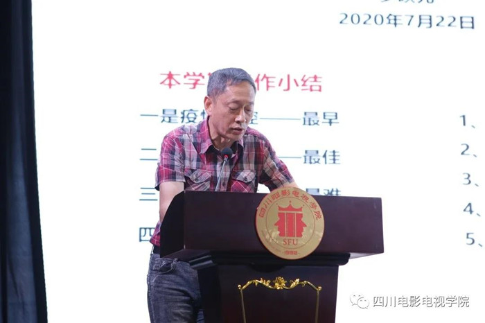 党委书记罗映光教授以“四个最”对本学期工作进行小结。一是疫情防控最早,为学校赢得了疫情防控的主动权;二是防控成效最佳,学校成立川影疫情防控领导小组,制定了“七案七制三流程”等相关制度,由于学校对疫情反应早、处理快,截至目前取得了无一例感染和疑似感染的最佳成绩;三是线上工作最难,每天线上报告师生健康状况、线上教学、线上考试、线上答辩、线上会议等等,都在不断打破固有的生活、工作和思维方式,也成为了一种新常态;四是党建思政最重,思政工作是一切工作的生命线,在防疫过程中,各级党组织和党团员肩负着十分繁重的责任,发挥着十分积极的作用。