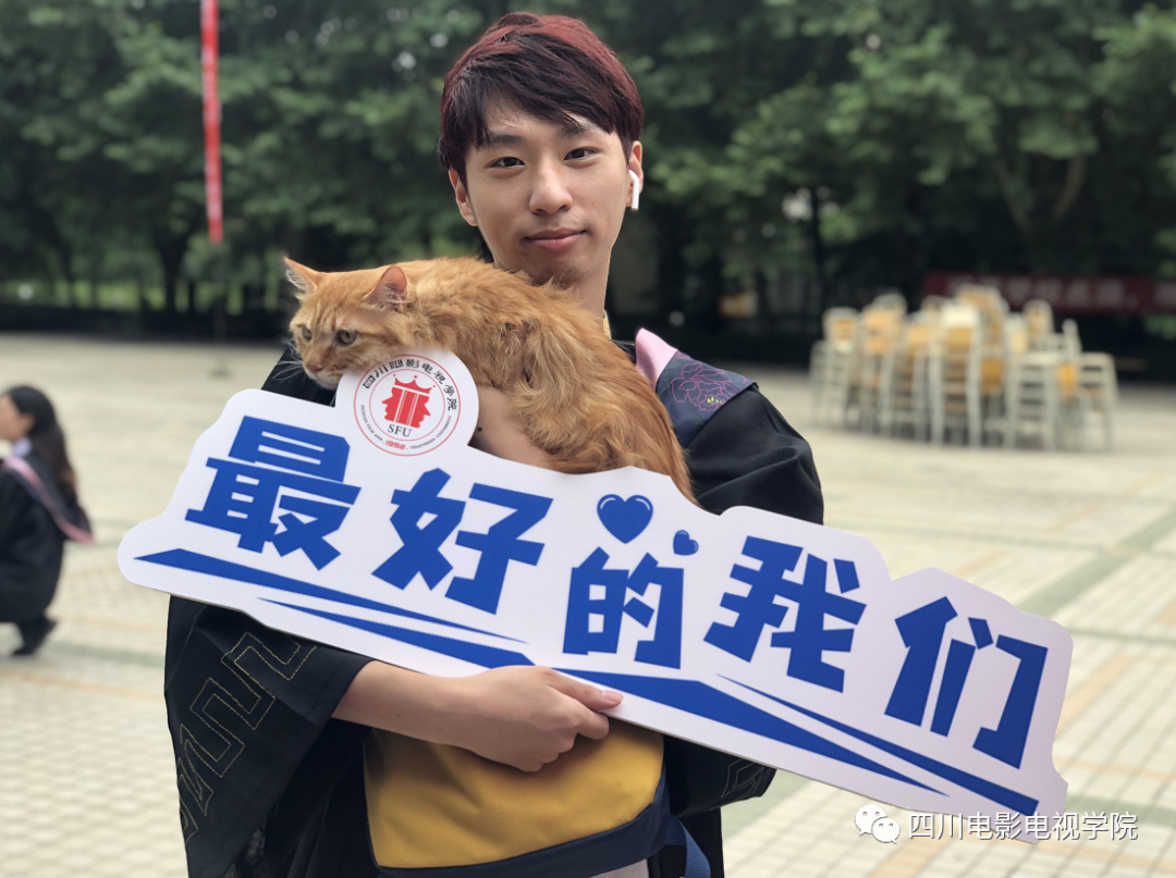 它叫“鳌拜”,两年前,它本是学校里出生的一只小流浪猫,后来被川影学子悉心照料,并带回了家中收养。今天,收养它的“铲屎官”毕业了,也带着它一起回到学校参加毕业典礼,因为这里,是他们梦想开始的地方。
