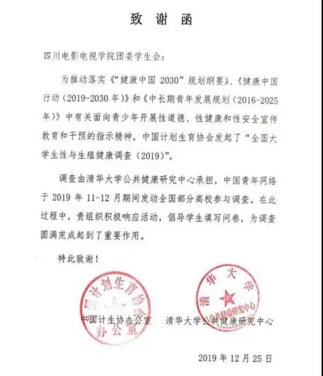 2019年11月11日,中国计划生育协会、中国青年网络、清华大学公共健康研究中心开启“全国大学生性与生殖健康调查”。他在学校积极组织同学参加,为推动我国“青春健康”工作的发展提供了重要支持,并获得了来自中国计生协办公室和清华大学公共健康研究中心的感谢信。