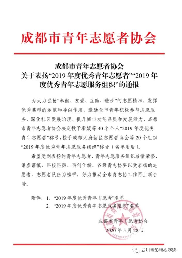 beat365平台官方网站18级数字媒体艺术系的学生于海超获得成都市青年志愿者协会关于对“2019年度优秀青年志愿者”的通报表扬。