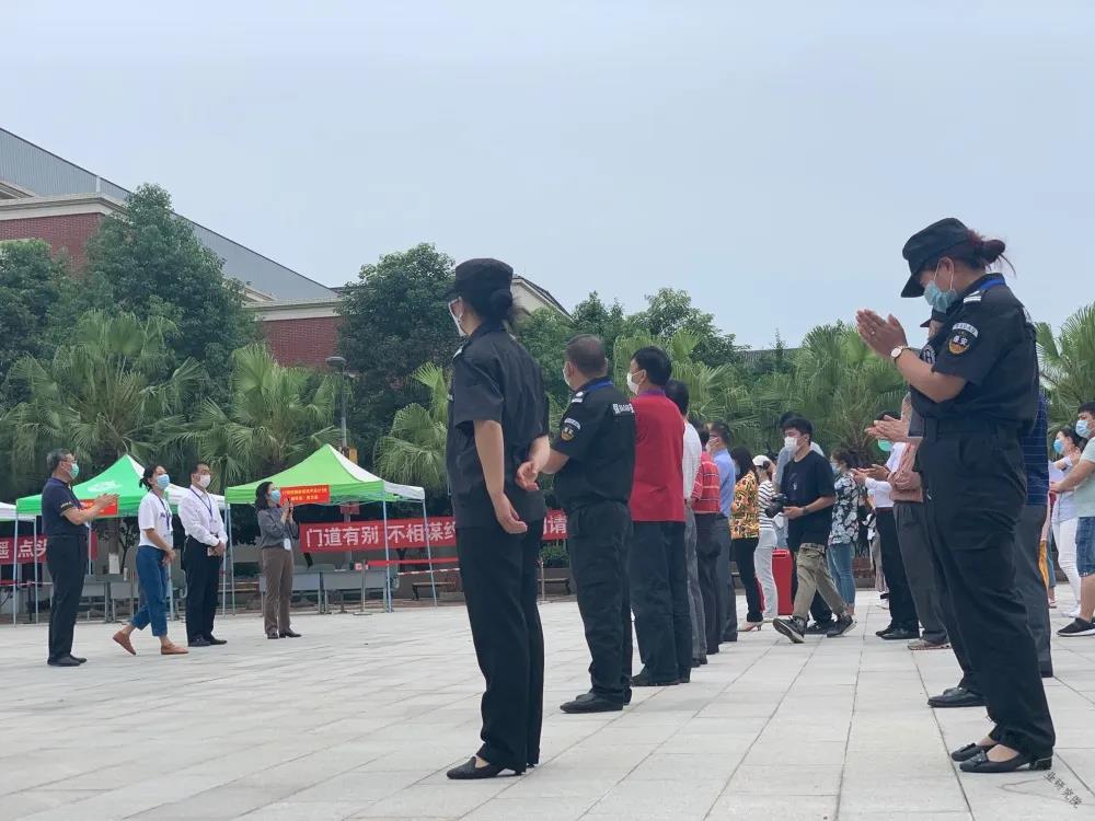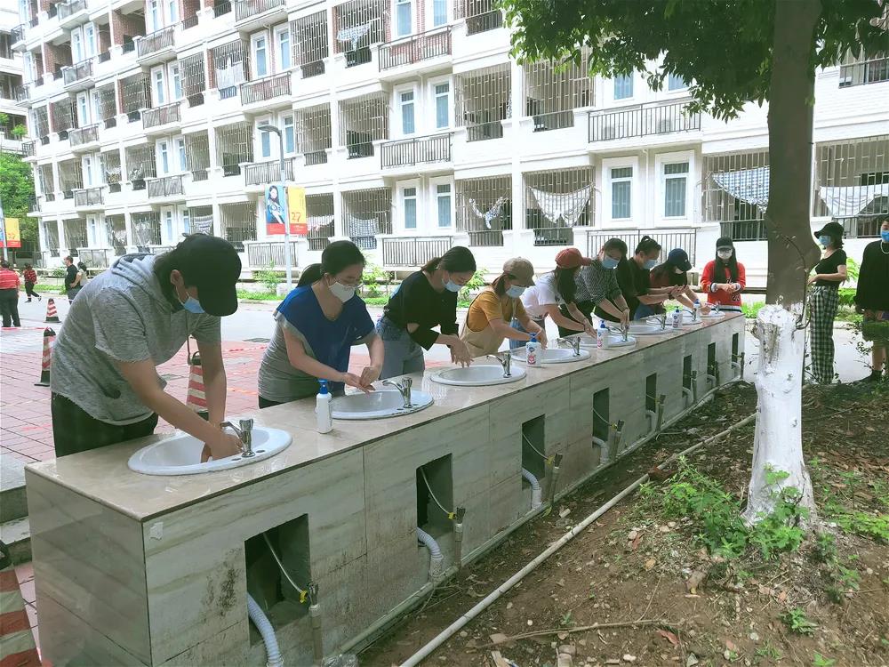 下午3点10分叶文林副校长宣布演练正式开始。由我校60位辅导员扮演的“返校学生”在校门口间隔一米有序排队,根据工作人员的指示依次进行物品消毒、口罩更换、健康码检查、体温检测。