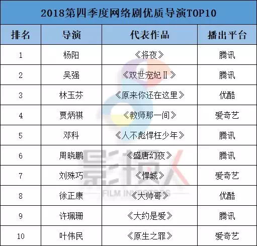 而在2018年第四季度(数据截止日为2018年12月29日)的排位中,贾炳祺小哥哥站上了“最具投资价值网络影视导演”第四名的高度,同时占据了在爱奇艺播出的网剧排名第一顺位,俨然成为了新晋网络影视导演中冲出的一匹黑马!同样上榜的还有香港知名导演林玉芬作品《原来你还在这里》,台湾当红偶像剧导演许珮珊作品《大约是爱》,曾执导《投名状》《人在囧途》的叶伟民导演操刀的悬疑网剧《原生之罪》,以及《将夜》《双世宠妃2》等热门网剧。