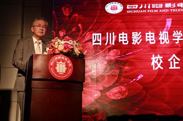 随后,松下电器小川彰久总经理致辞,他对学院长期使用松下的4k高清设备表示感谢。他表示,此次签订合作协议只是双方合作的第一步。未来松下将在影视摄制基地共建、教学专业设施建设、广电技术咨询服务、专业技术培训乃至专业教学领域,更多地深入川影的广播电视教育教学,发挥其作为全球领先的广播电视专业设备提供商对中国广播影视高等教育教学的影响力。也希望极具行业影响力与前瞻性的专业影视院校的学生首先使用到最新科技,以专业的角度提出改善意见,希望双方携手为中国教育与传媒业做出贡献。同时,松下电器BCS野村一生总经理也对最新的设备作了介绍。