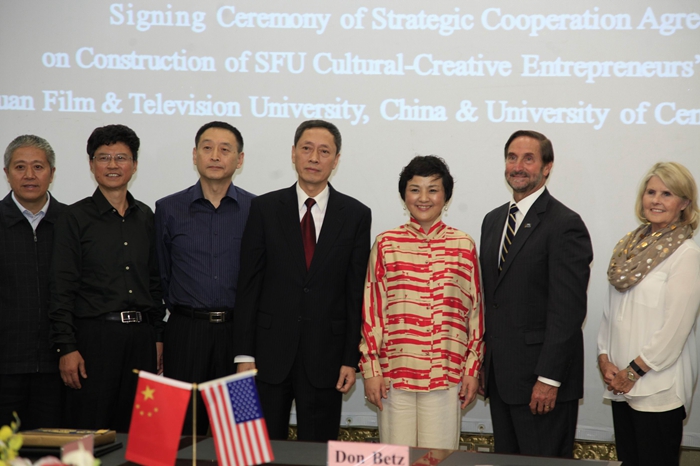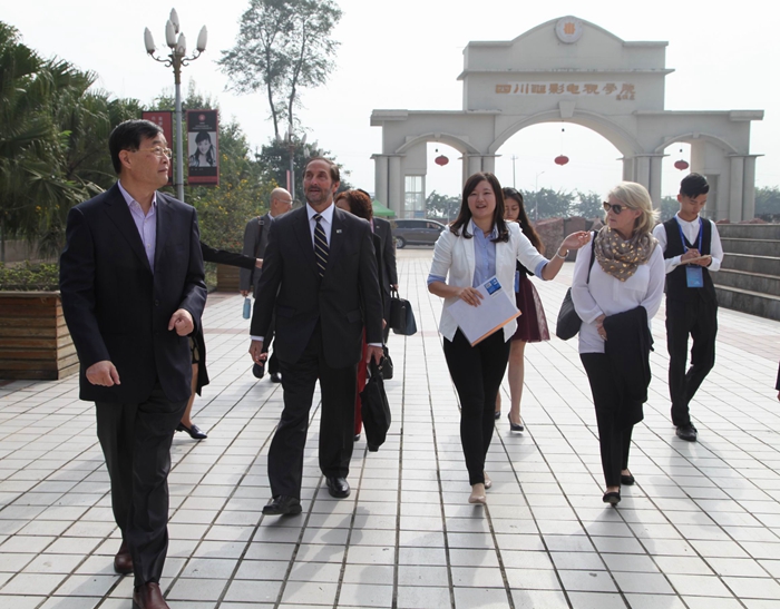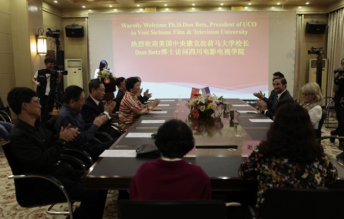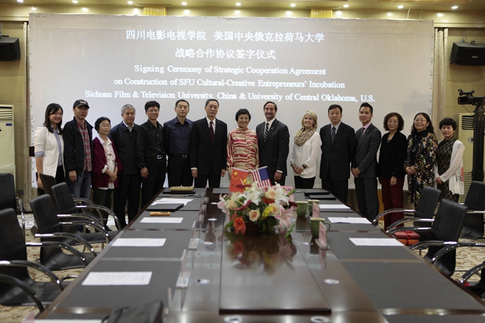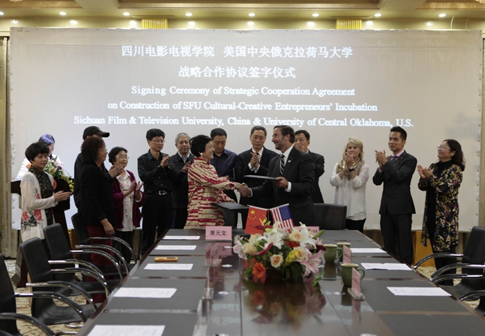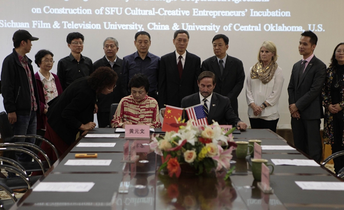 2015年10月10日,美国中央俄克拉荷马大学校长Don Betz博士一行与川影正式签订共建“beat365平台官方网站文化创新创业园”战略合作协议。Don Betz博士一行在学院董事长黄元文、院长罗共和、党委书记罗映光等领导陪同下,先后参观了安仁、金牛校区,听取了学院关于“文化创新创业园”的设计方案。Don Betz博士表现出极高的关注度,他说这是一个极具意义的创举,将成为高校示范性影视基地,希望大力配合学院推动“文化创新创业园”的建成。