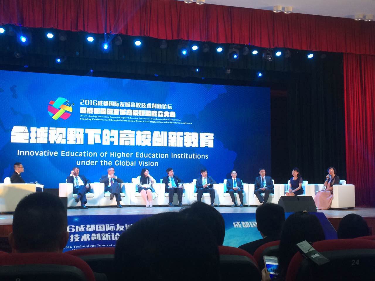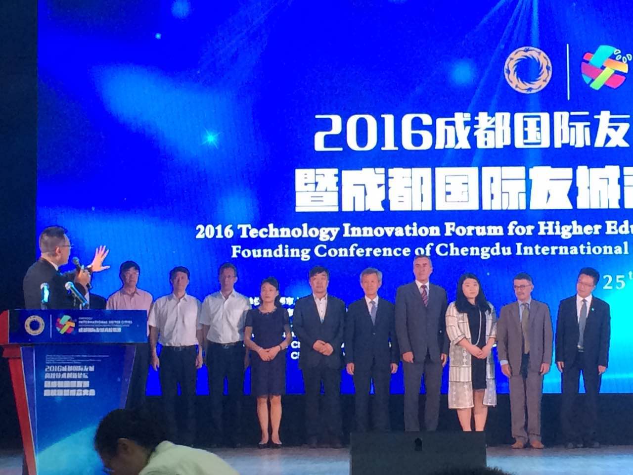 6月25日,学院院长罗共和在国际交流中心主任罗铸泉的陪同下,应邀出席了由成都市人民政府主办,成都市人民政府外事侨务办公室、成都大学承办的2016年成都国际友城高校技术创新论坛暨“成都国际友城高校联盟”成立大会。期间,罗铸泉主任代表川影在论坛上作了“全球视野下的高校创新教育”主题发言。出席本次大会的还有新西兰怀卡托理工学院、丹麦VIA大学、荷兰南方应用科技大学等国外高校领导,电子科技大学、西南交通大学、西南财经大学等在蓉高校领导,以及泰国清迈府副府尹代表团、成都市国际友城公务员代表团。