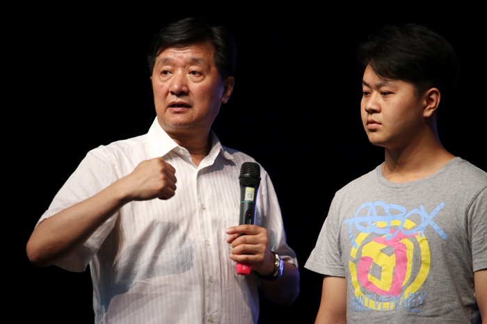 讲到技术性问题时,张院长请两位同学上台作示范,对人物位置的8种关系(面对面、肩并肩、背靠背、前后位、左右位、直角形、错位、外三角)和6种形体关系(站、坐、跪、倚、躺、趴)进行细致讲解,用实例告诉同学们,这些位置关系的变化会直接决定一部戏的风格和导演创作的视听语言。他表示,对话人物双方要基本保持景别一致,叙事景别可以完全一致。