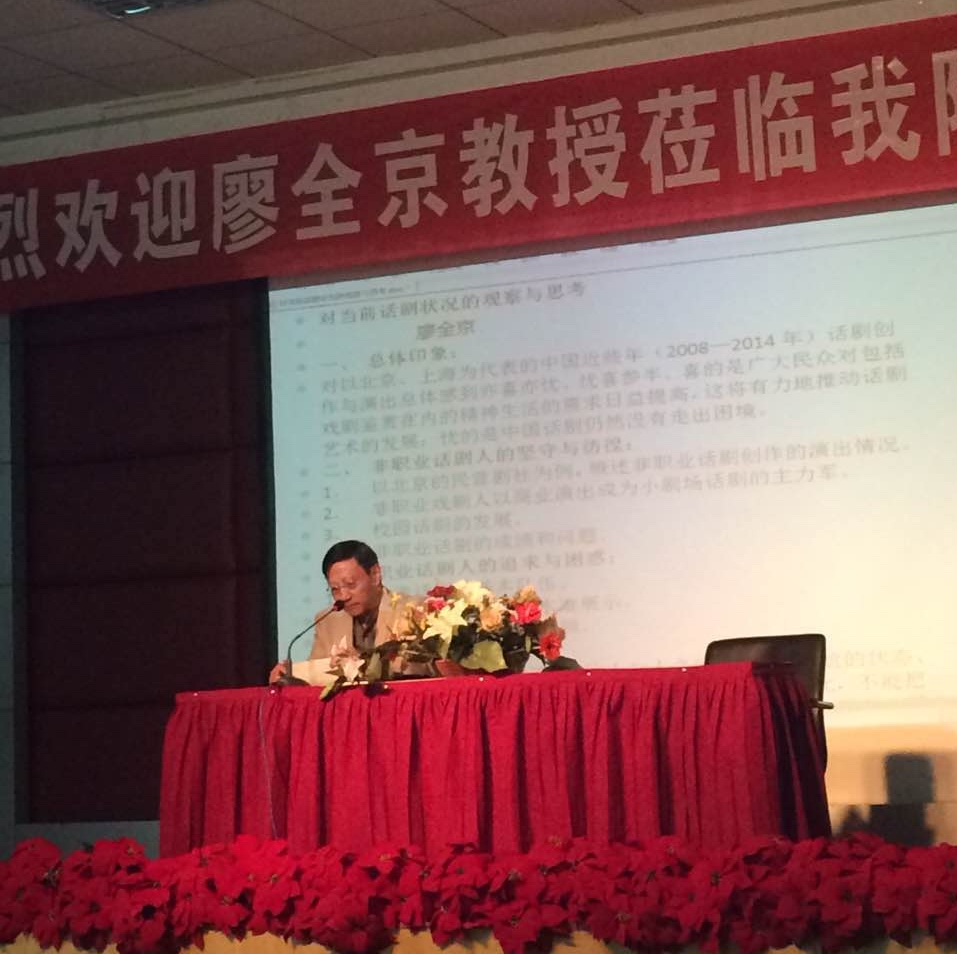 廖全京教授以北京、上海为例分析了当前话剧发展趋势,对非职业话剧人的坚守和彷徨进行深刻阐述。他说:“北京的非职业话剧人一方面进行着自我兴趣创造,另一方面就是盈利,他们逐渐成为小剧场商业话剧的主体,随着生活水平的提高,戏剧市场越来越大,话剧的主题以喜剧为主,成绩与泛滥并存。”廖教授认为,当前话剧在艺术繁荣的同时,低俗化、同质化、文学性缺失也造成了戏剧艺术水准在下降。并以《冬之旅》《蒋公的面子》为例,从题材、主题等方面全面回答同学们关于如何选取创作题材、如何创作高质量话剧的疑问。