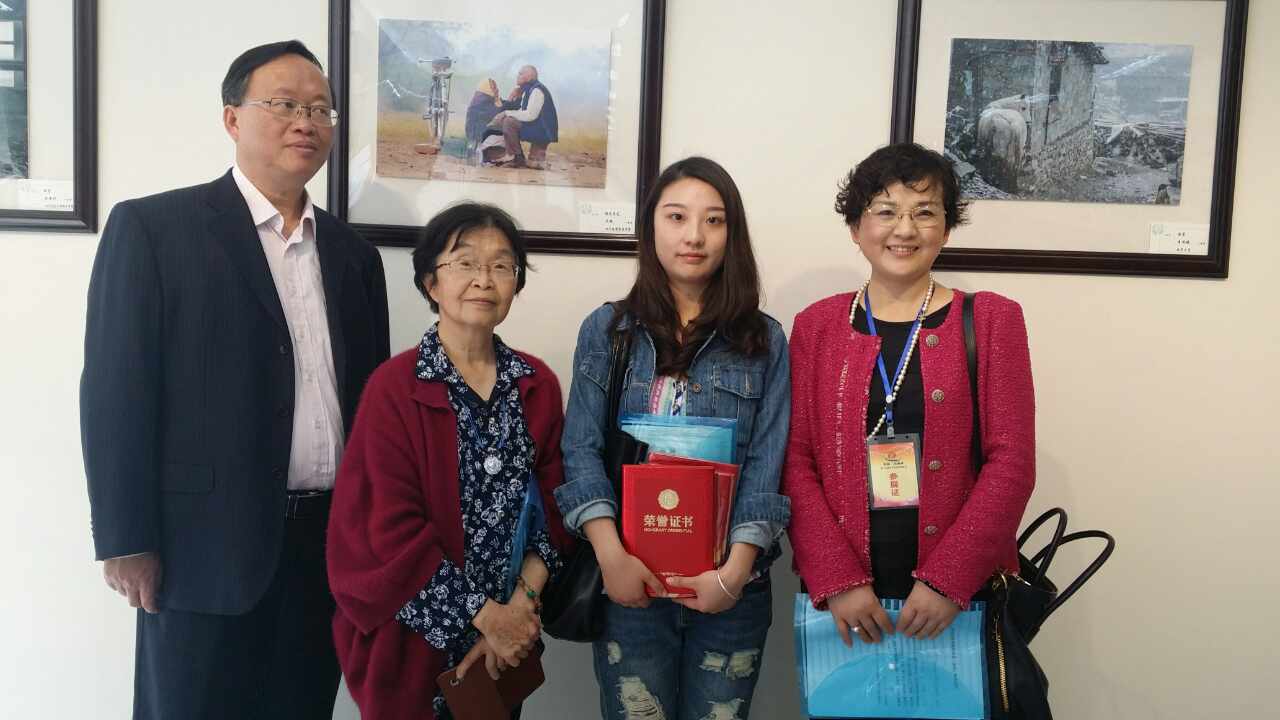 学院董事长兼副院长黄元文、导演系主任白山杉教授、学院学生米艳与协会会长张强教授在获奖作品前留影