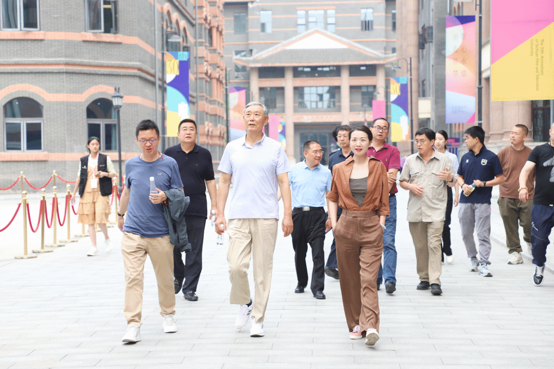 交流座谈前,崔强董事长一行参观了四川影视文创城摄影棚、年代实景街区、服装道具中心、图书馆、电影学院虚拟数字摄影棚、校史馆等极具特色的教学实训场地,肯定了川影在教学与科研工作方面取得的成绩。