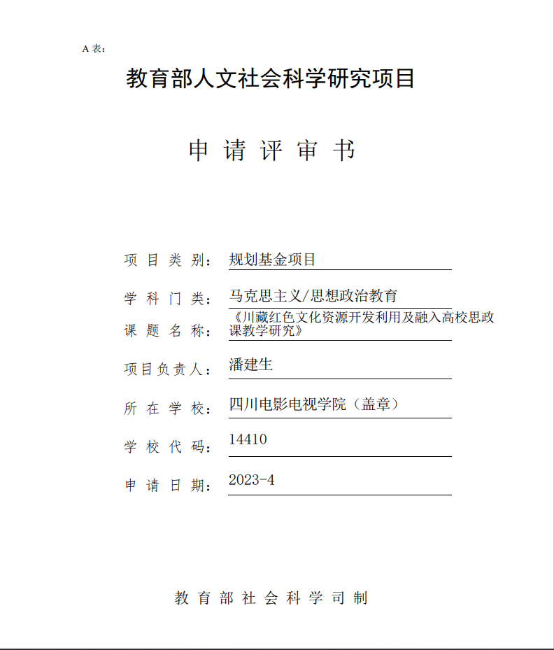 近日,从教育部获悉,我校马克思主义学院学术带头人潘建生教授申报的《川藏红色文化资源开发利用及融入高校思政课教学研究》项目获得2023年度教育部人文社会科学研究规划基金一般项目立项。该项目全面深入研究川藏地区红色文化资源形成的历史脉络及其历史底蕴、新时代挖掘和利用川藏地区红色文化资源的优势与问题、探求全面推进中国式现代化中开发利用和传承传播川藏地区红色文化资源及融入高校思政课教学的路径和对策。项目教育部配套科研经费100000元,学校配套科研经费100000元。