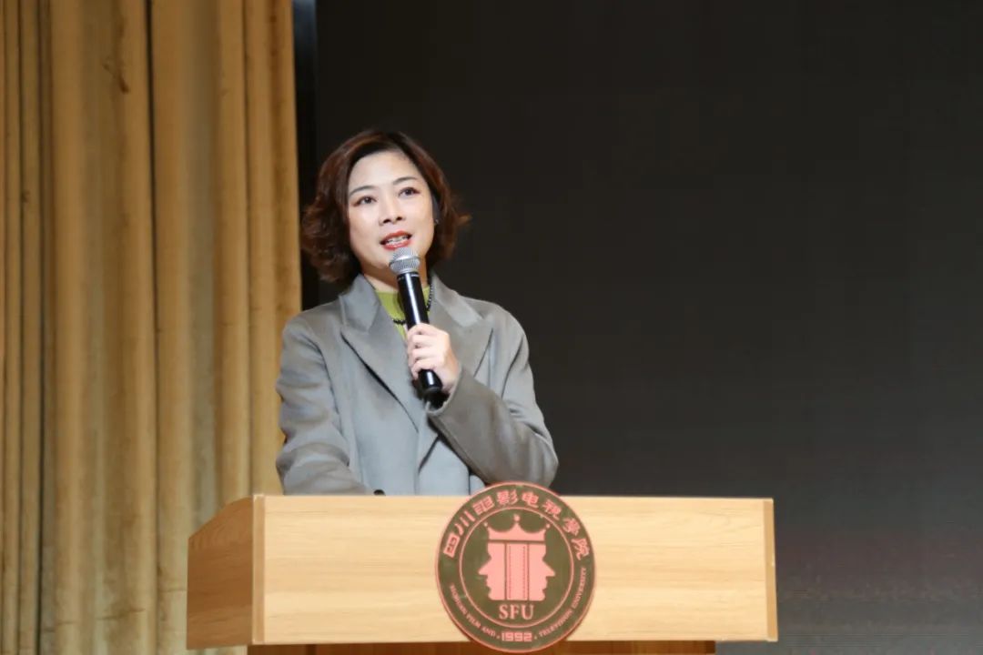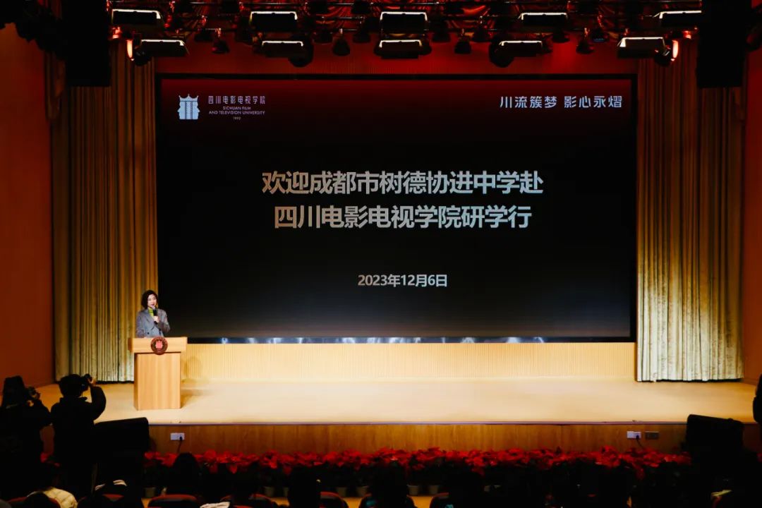 在研学活动正式开始前,川影电影学院副院长郭怡然对成都市树德协进中学师生致欢迎词,向同学们介绍了川影的知名校友和创作的文艺作品,以及在影视传媒行业内取得的创新成果。她以“电影是如何诞生的”为引,向前来研学的同学们生动介绍了此次的研学内容,将从导演、编剧、表演、服化道、摄影五个方面进行参观、体验,燃起同学们的探索欲。