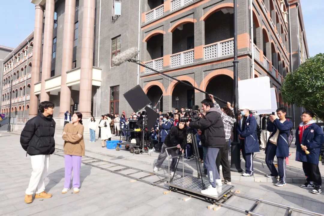 学生们来到电影学院外景拍摄点,进行电影拍摄过程的观摩。在现场,不仅见到了摄制中轨道的使用,演员对镜头的配合,还有监视器后面的导演如何进行现场导戏等。
