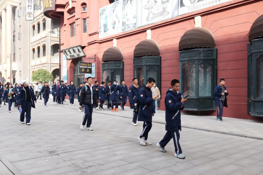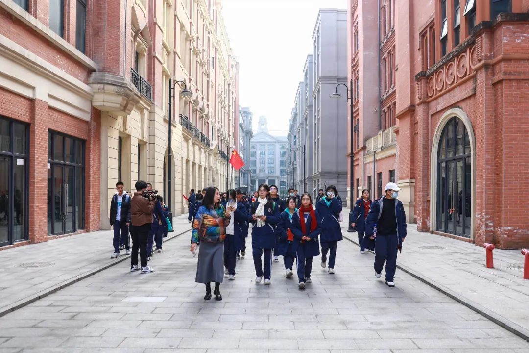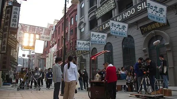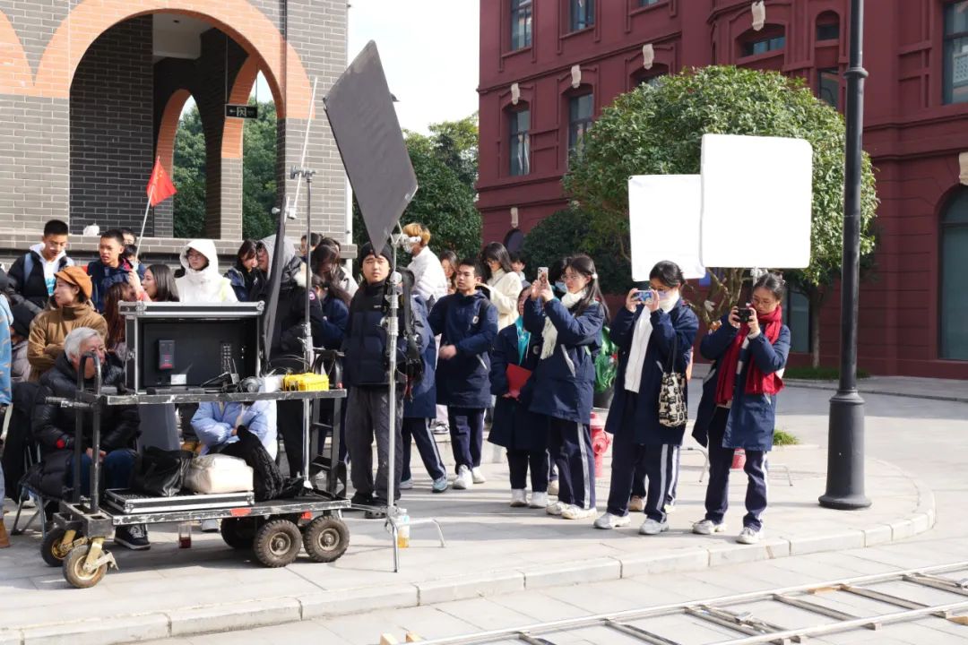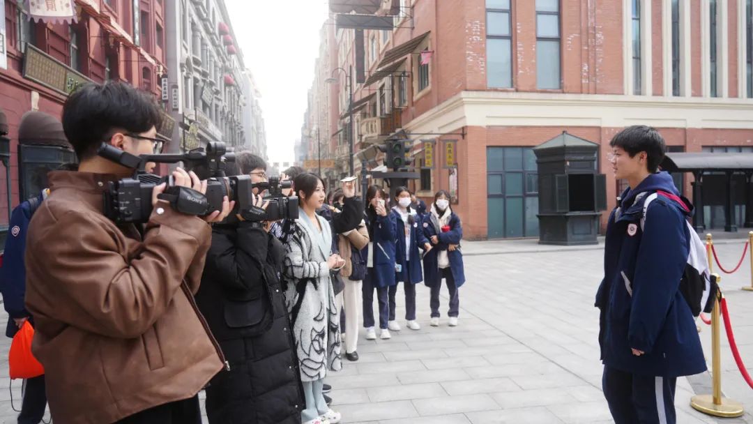 走到年代街区,“百乐门”“兰心大剧院”等映入眼帘,身着民国服装的演员们坐在黄包车上,面对镜头从容不迫地展现角色魅力,同学们忍不住合影留念。