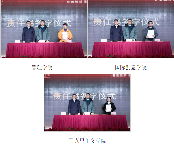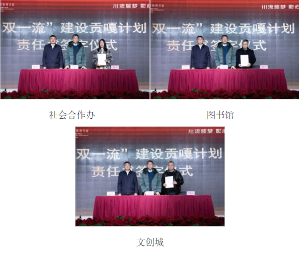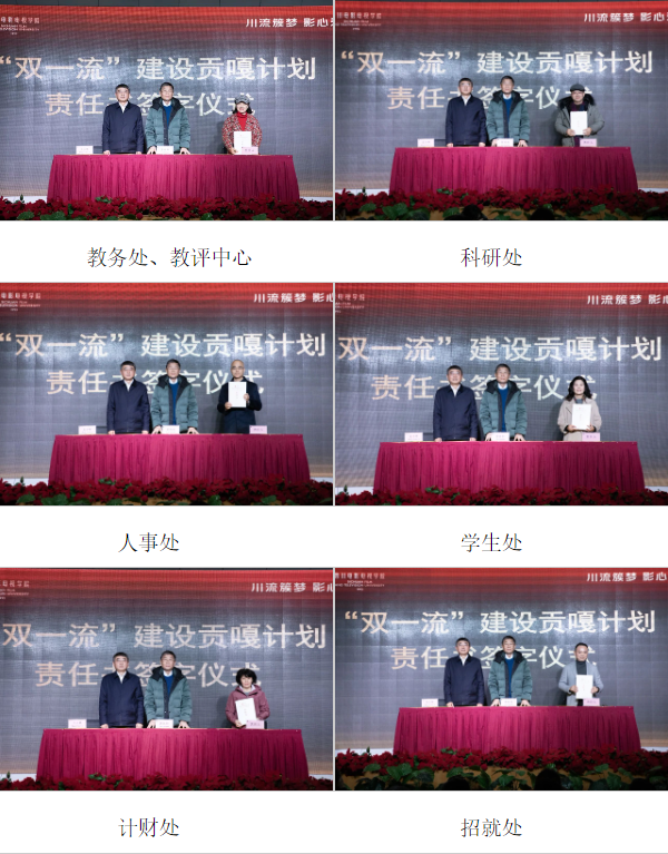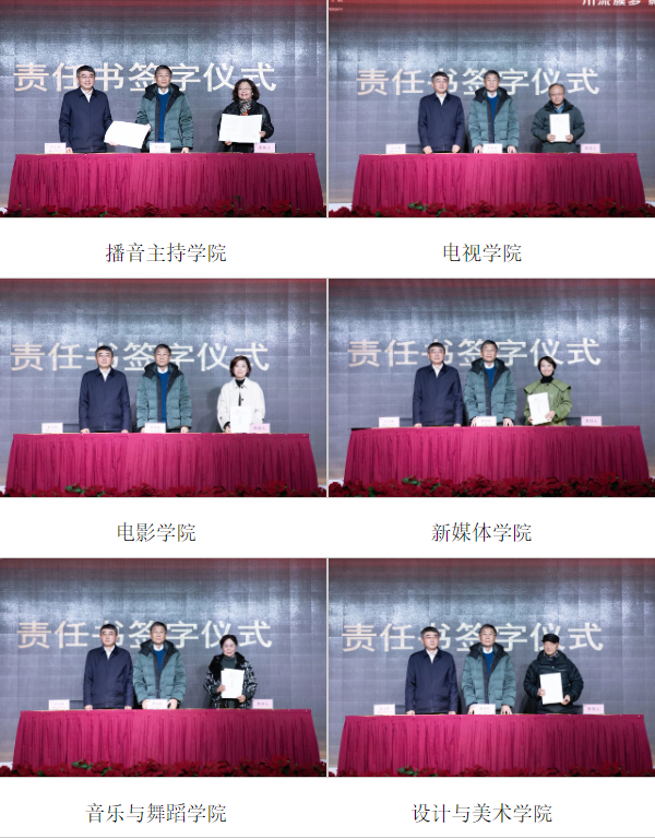 川影播音主持学院、电视学院、电影学院、新媒体学院、音乐与舞蹈学院、设计与美术学院、管理学院、国际创意学院、马克思主义学院、教务处、教评中心、科研处、人事处、学生处、计财处、招就处、社会合作办、图书馆、文创城负责人依次上台签订目标责任书。