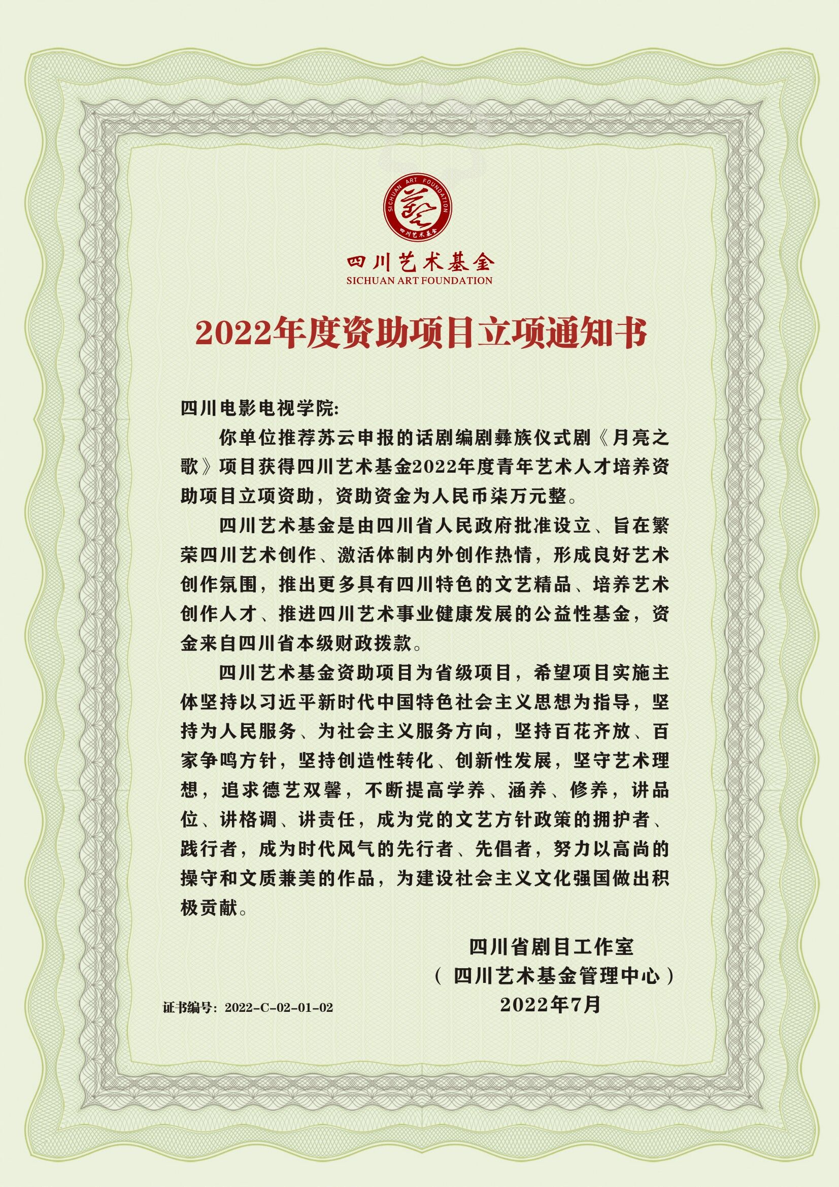近日,我校电影学院苏云老师主持研究的四川艺术基金资助项目《月亮之歌》(项目编号:2022-C-02-01-02)经四川艺术基金管理中心评审正式结题。