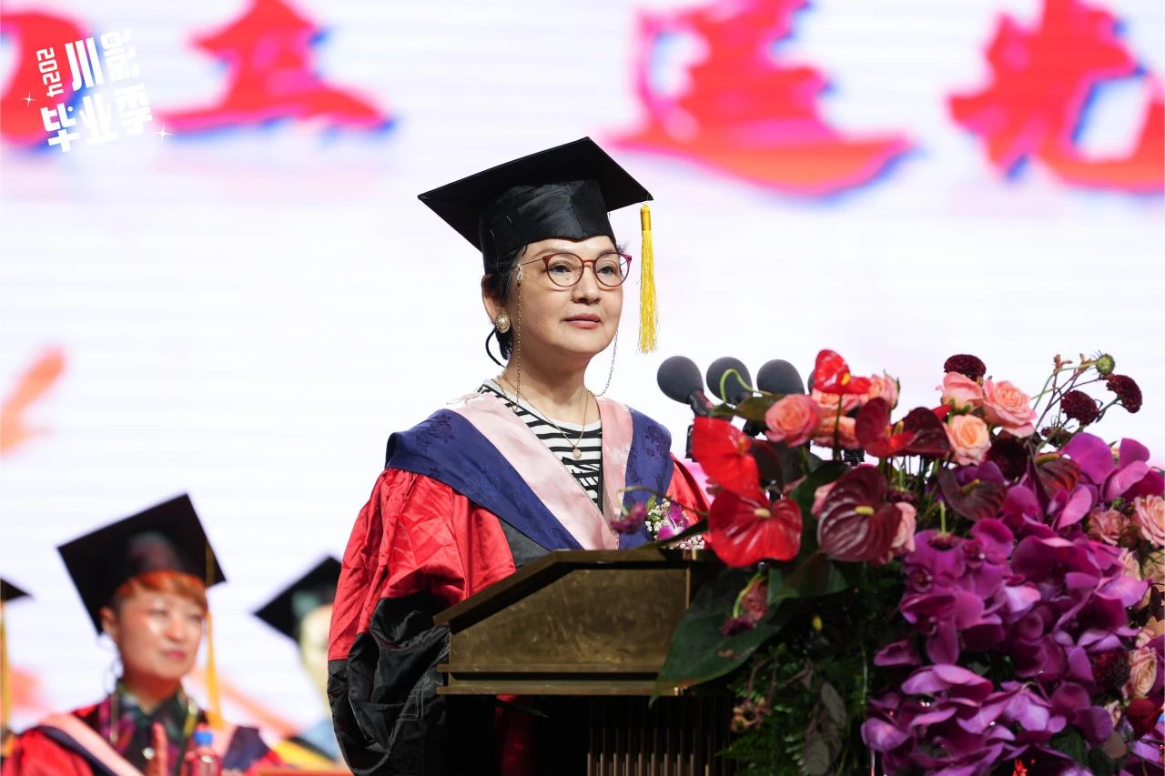 “曾记得我们共同经历了一场前所未有的疫情大考,体验过最严格的返校流程,上过最频繁的网课……一路走来,母校欣喜于你们的成长和蜕变。”董事长黄元文教授回顾了同学们在川影的求学时光,并向2024届毕业生送上了殷切的叮咛和深情的嘱托:永葆热爱,做对成功充满渴望的人,希望大家无论身在何处,磨炼与坚持,久久为功,创造人生精彩;善良真诚,做一个懂得感恩的人,父母之恩,教育之情,终身相报。
