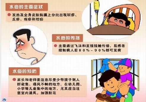 水痘病毒存在于患者呼吸道鼻咽分泌物和疱疹液中,主要传播途径是经空气飞沫传播和直接接触水痘疱疹液传播,也可通过被水痘病毒污染的衣物、玩具、用具接触传播。水痘的传染性很强,出疹前1日至疱疹完全结痂时均有传染性,易感儿童接触后90%发病。