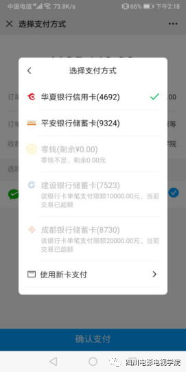▲微信余额支付方式请提前充值足够余额。选择银行卡支付方式未找到自己的银行卡,选择上图“使用新卡支付”添加个人银卡卡支付方式支付。