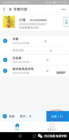 2、缴费大厅选择“学费”或直接进入登录页,根据页面提醒输入信息点击“确认”进入学费页面,勾选需要缴费的项目,点击“结算”进行支付:
