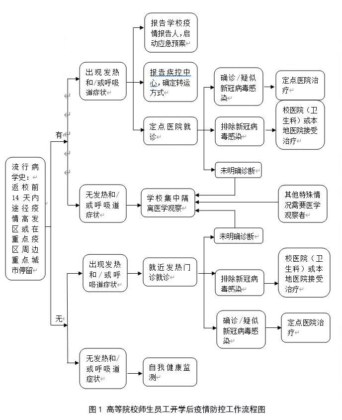 (一)师生可疑症状及病例处置。师生若出现发热、干咳、气促、呼吸道症状等异常情况,应及时到校医院(卫生科)就医;若发现疑似病例,应立即向学校疫情报告人报告同时启动应急预案。按照早发现、早报告、早隔离、早治疗的原则,学校应于2小时内向当地疾控机构、卫生行政部门、教育主管部门报告,配合做好人员核查排查和后续相关工作(图1)。对疑似病例学习、生活场所和用品用具等按照当地疾控机构的要求及时进行终末消毒。