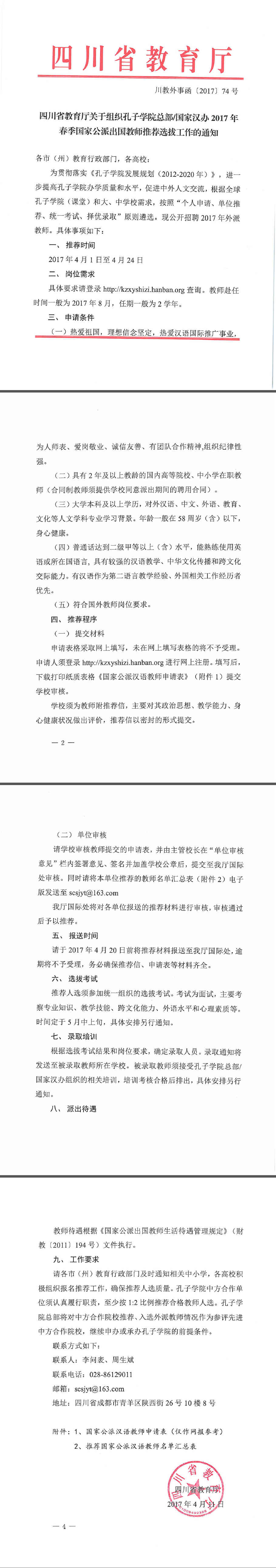 四川省教育厅关于组织孔子学院总部/国家汉办2017年春季国家公派出国教师推荐选拔工作的通知