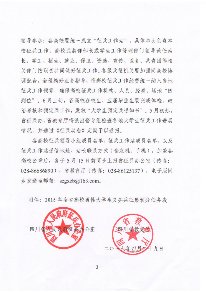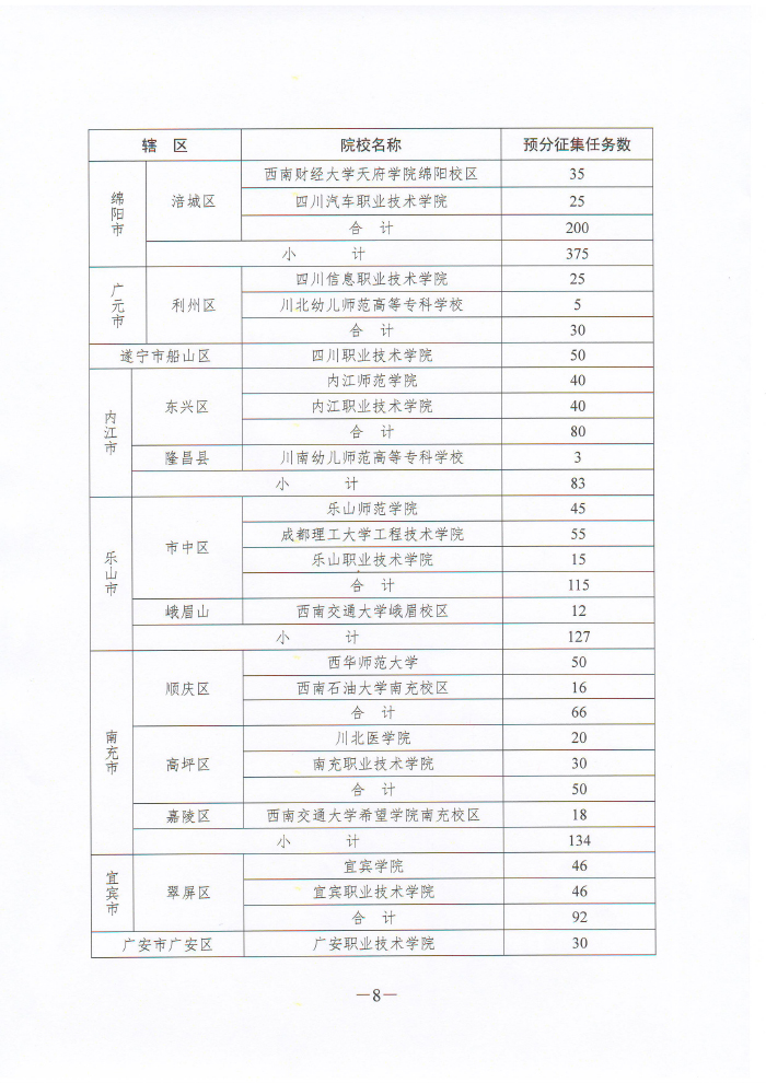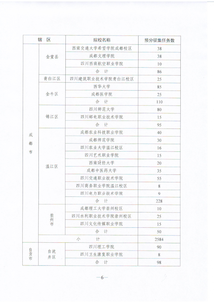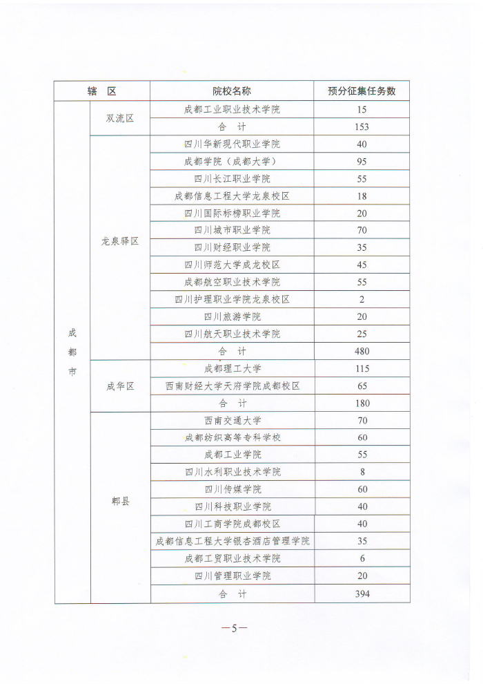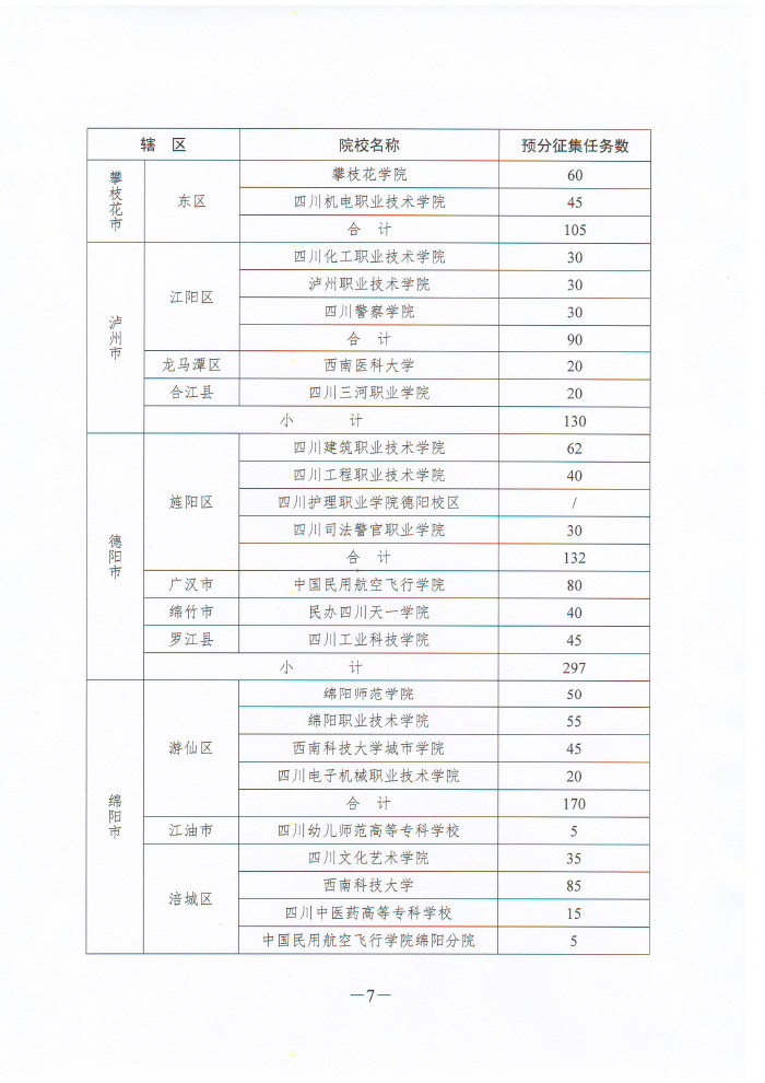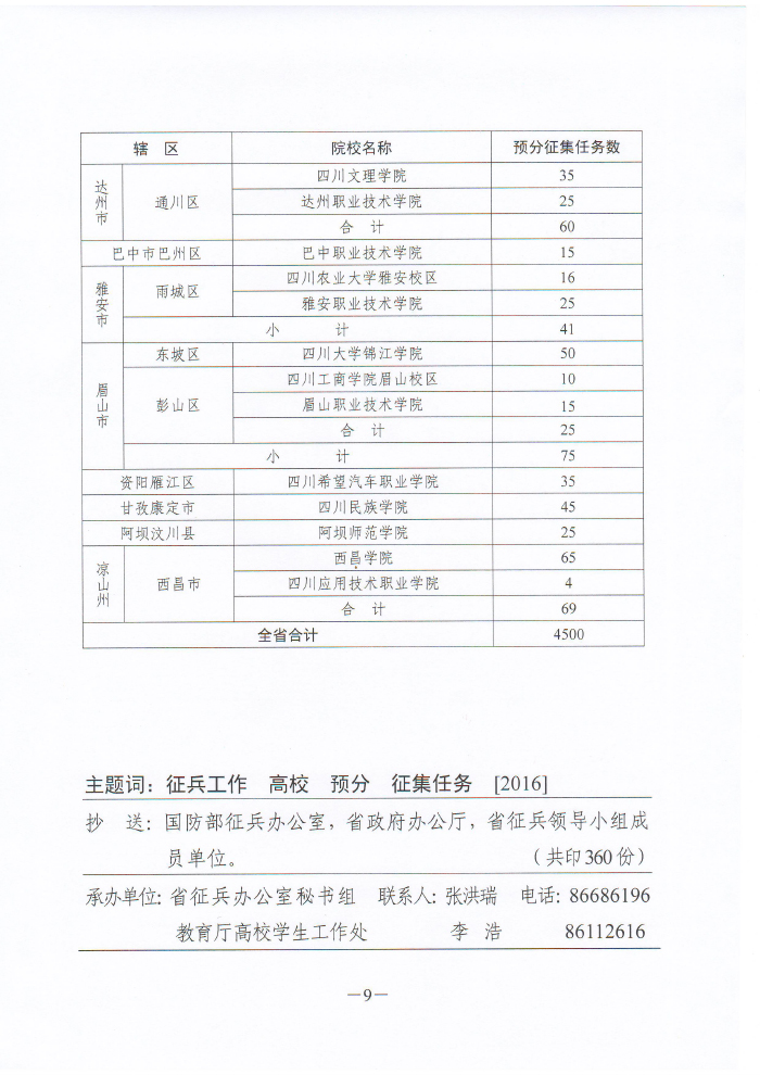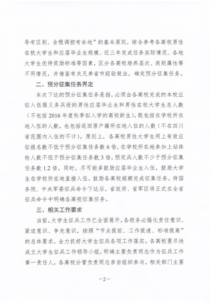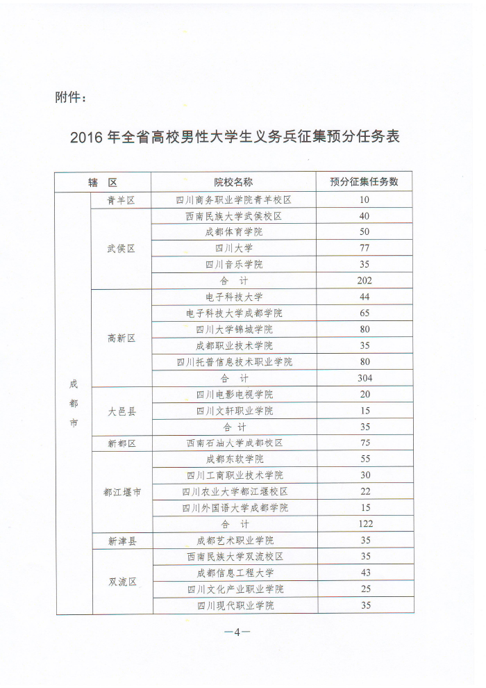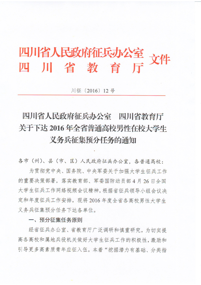 四川省人民政府征兵办公室 四川省教育厅关于下达2016年全省普通高校男性在校大学生义务兵征集预分任务的通知
