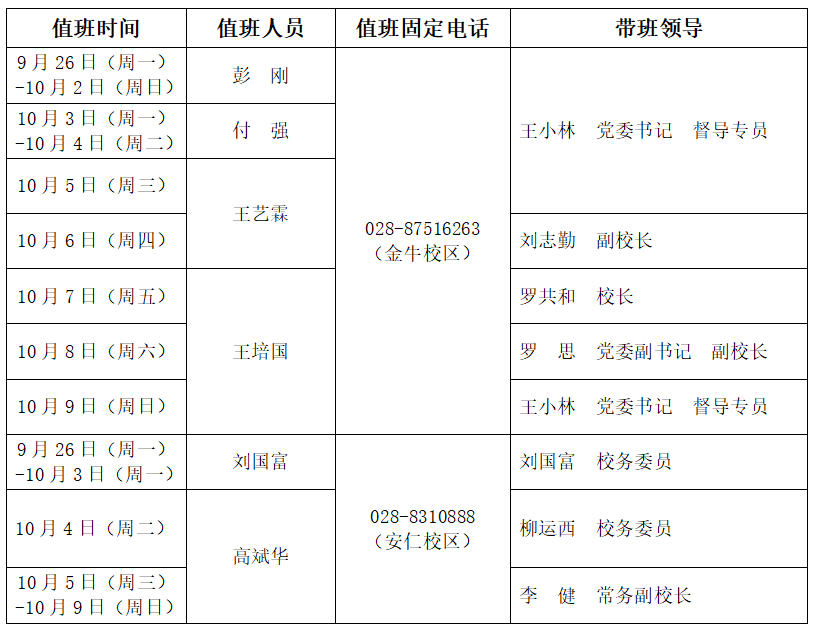 金牛校区总值班负责人:王小林 总值班协调:孙龙萍