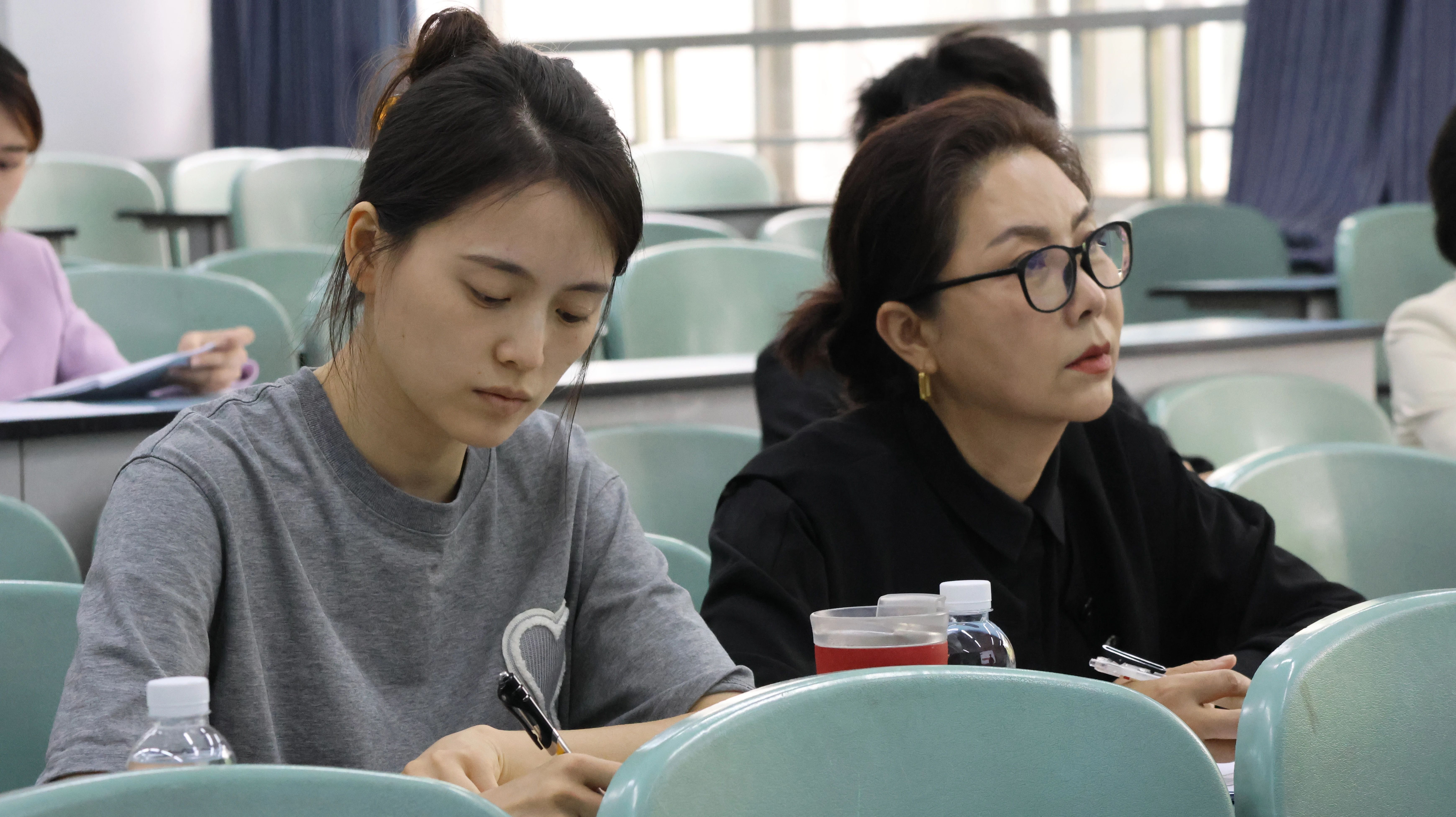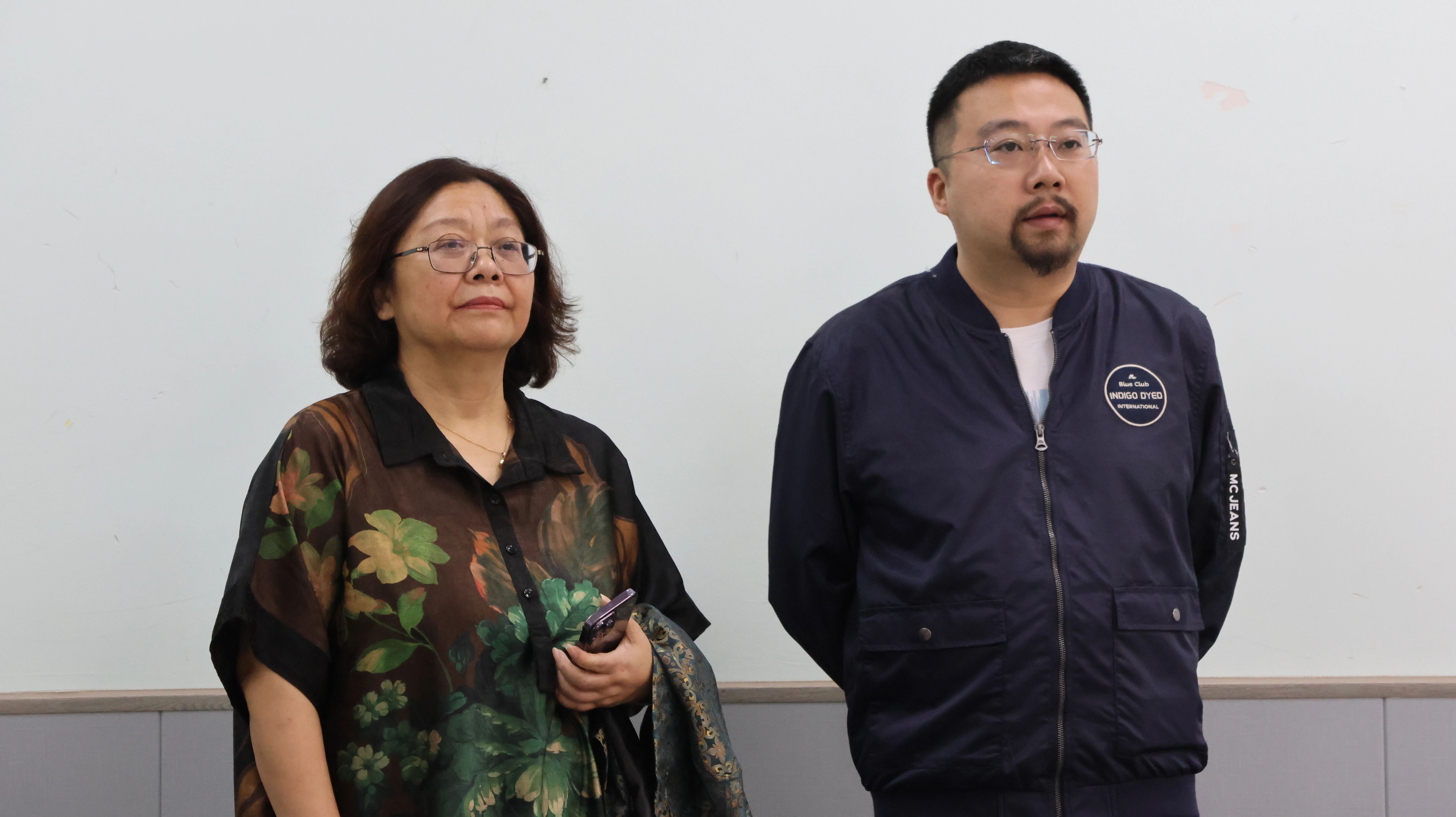 ▲播音主持学院院长赵小蓉教授(左)、副院长周欣教授巡视各答辩室