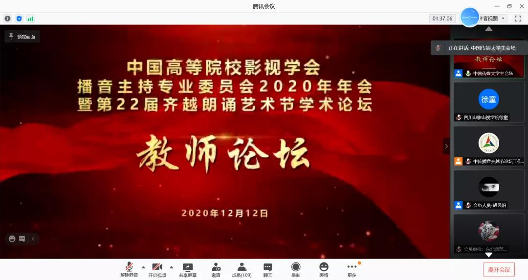 为庆祝中国人民广播80周年,中国高等院校影视学会播音主持专业委员会2020年年会暨第22届齐越朗诵艺术节学术论坛于12月12日举办。我院青年教师徐童作为四川省唯一受邀教师,在此次论坛的线上教师论坛中作题为《智媒时代主持艺术传播困境与发展应对》的论文宣读。让我们一起走进现场,聆听学术之声。