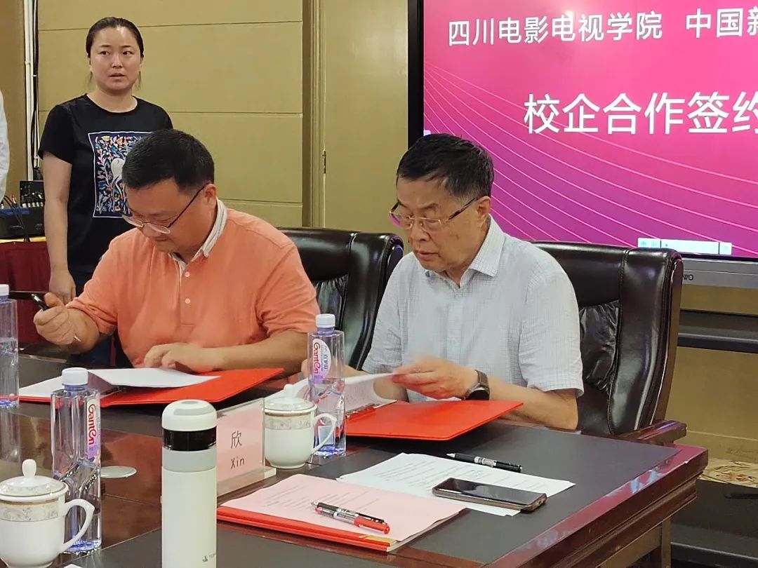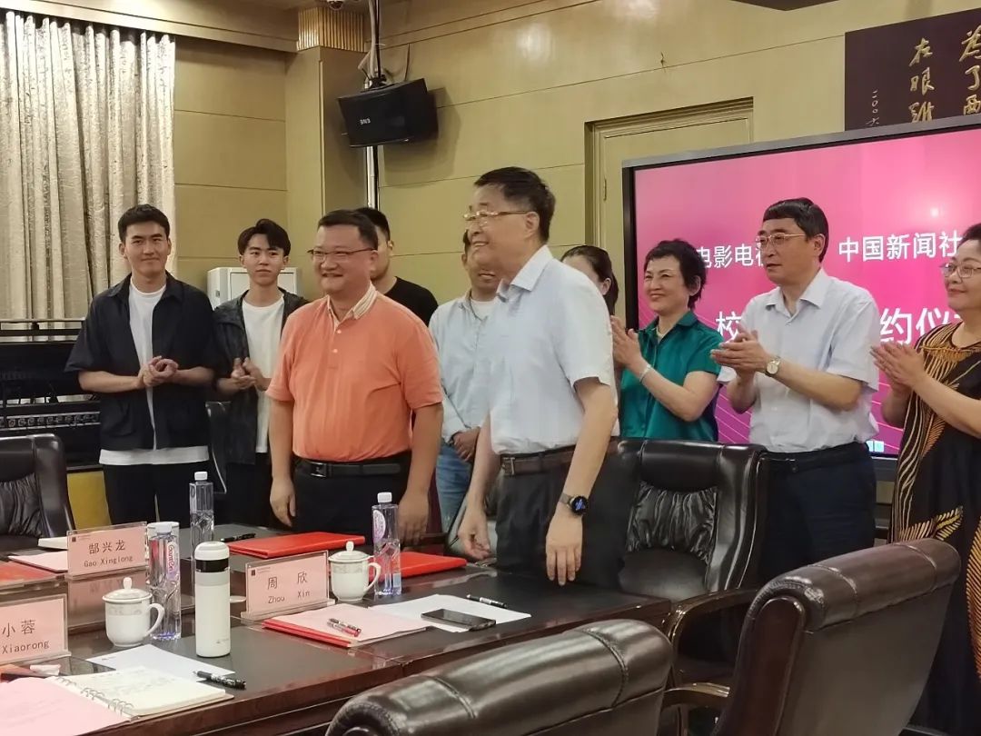 学校董事长黄元文,校长罗共和,党委书记王小林,播音主持学院院长赵小蓉,党委书记、副院长李丹,副院长周欣与中国新闻社四川分社社长邹辉、副总编辑徐杨祎、节目中心总监何芦恒等到场参加本次签约仪式。