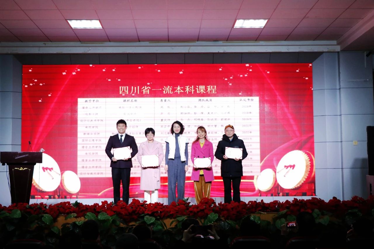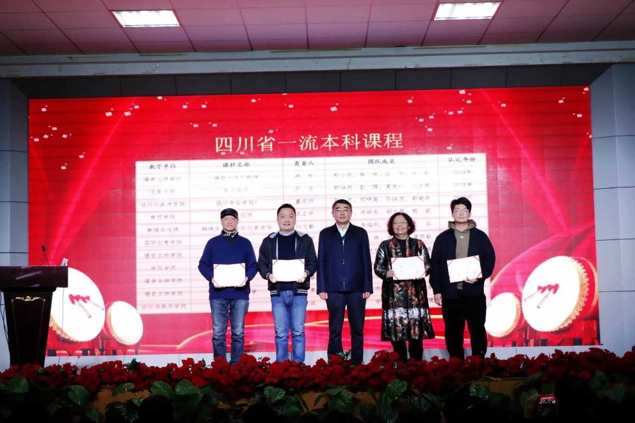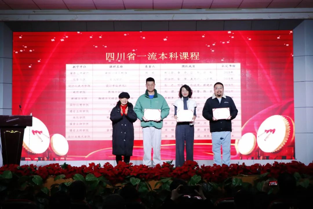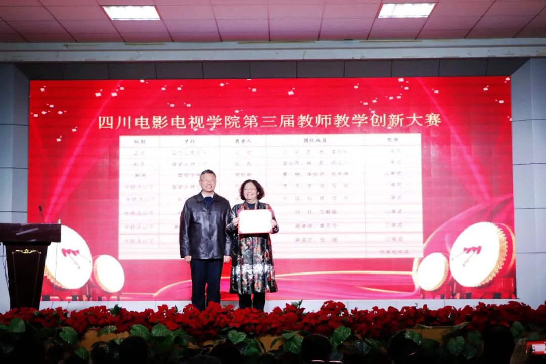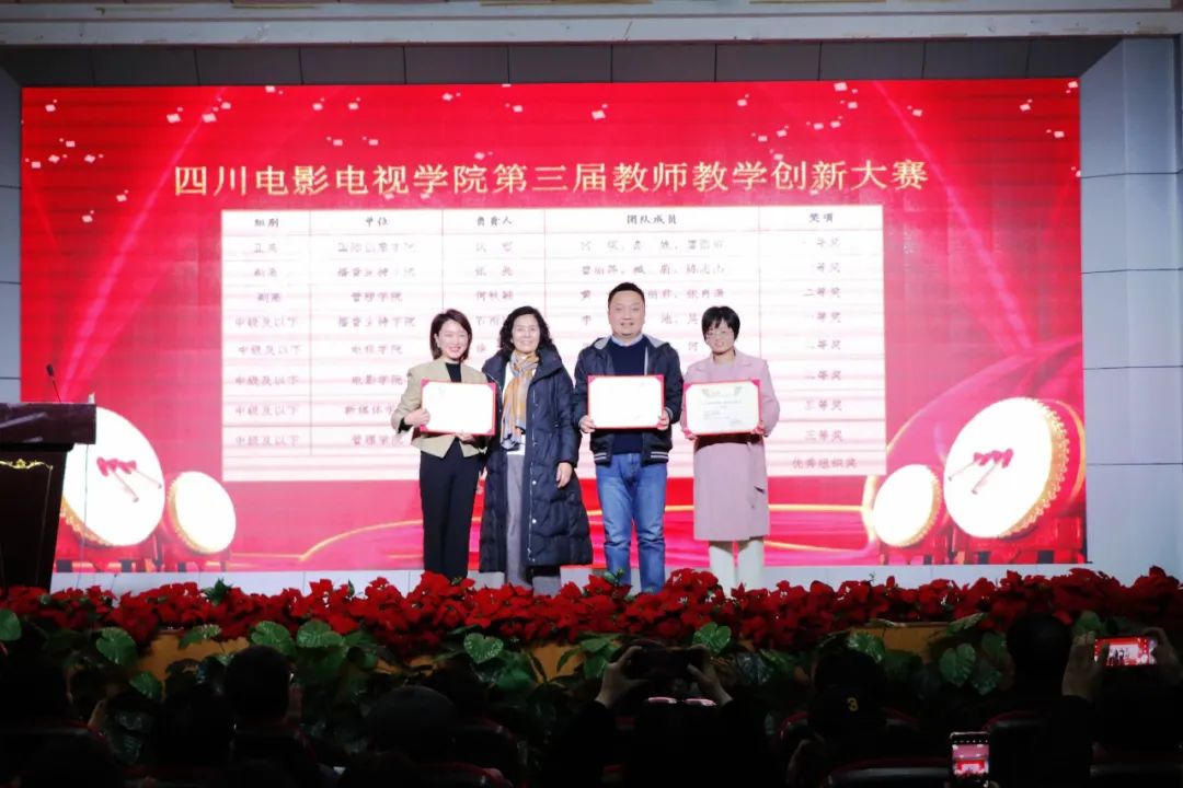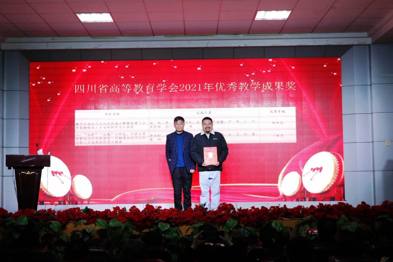 在下午的教学工作会最后,校领导还为2022-2023学年度第一学期各教学单位取得成绩的集体和个人进行了颁奖,播音主持学院获颁“第三届教师教学创新大赛”优秀组织奖;播主学院的张亮、石雨冰老师分别获颁“第三届教师教学创新大赛”副高组一等奖、中级及以下组一等奖;播主学院周欣老师团队负责的《电视一体化制作》课程荣获四川省一流本科课程(第一批)荣誉;播主学院赵小蓉老师团队、张亮老师团队、韩辉老师团队分别负责的《主持人学》、《普通话语音学》、《主持人思维》课程荣获四川省一流本科课程(第二批、第三批)荣誉;播主学院周欣老师团队申报的《基于社会主义文化大发展大繁荣背景下应用型融媒体人才培养的研究与探索》和韩辉老师团队申报的《以:“四新”“四融”为特色,打造全国有影响力的思维课程——对融媒体时代应用创新人才培养的研究与探索》分别获得四川省高等教育学会2021 年优秀教学成果奖。