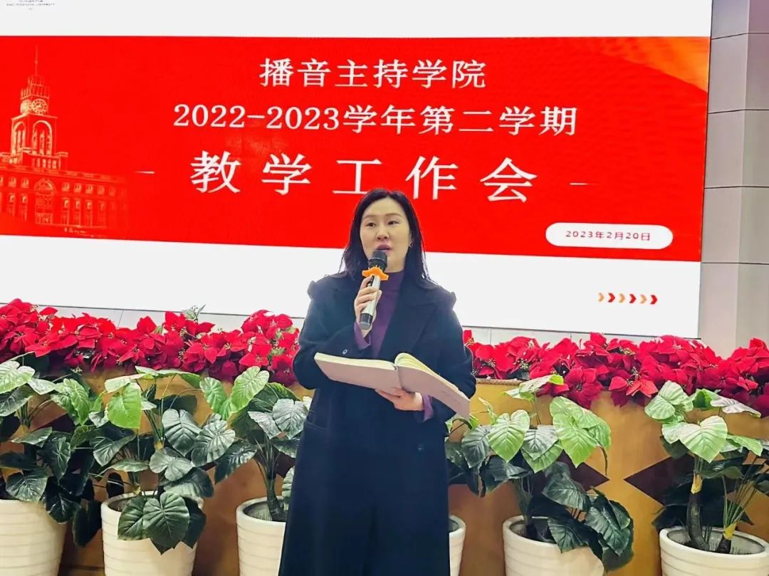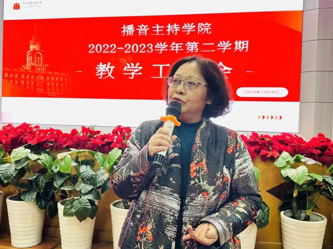 接下来,播音主持学院党委书记、副院长李丹教授从立德树人、产教融合和专业培训三个方面进行了规划和解读并提出了具体要求,她说,传媒专业的高等教育在立德树人和意识形态方面必须坚持正确的政治方向,而在产教融合方面必须加强行业用人需求的了解,实现校企、校台等的协同育人,她强调,在过去的三年,由于客观条件的限制,教师专业培训方面收到了比较大的影响,随着新冠疫情“乙类乙管”后社会秩序的迅速恢复,播主学院将发扬传统继续开展教师的专业培训,邀请行业大咖、业界精英、教育专家为老师们开展针对性强的继续教育和培训,持续提升播主学院教师的专业能力和素养。